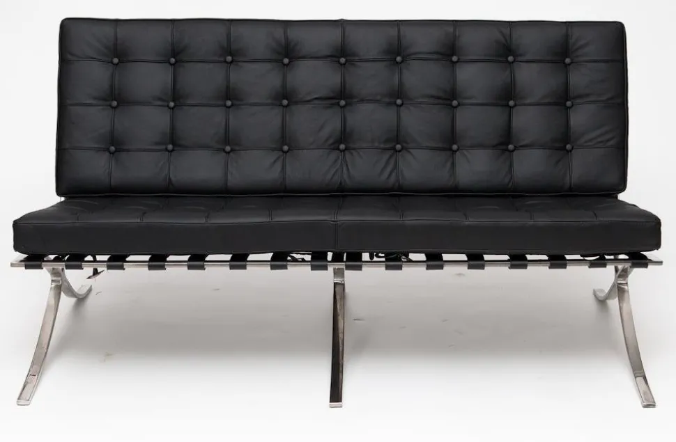 Jest to zaprojektowana w 1929 roku sofa, która powstał na zamówienie, i stanęła w niemieckim pawilonie na wystawie w Barcelonie.,Charakterystycznie powyginana w kształt litery „X” chromowana podstawa oraz pikowana w kwadraty skóra ekologiczna to najbardziej charakterystyczne cechy tego produktu. Cała kolekcja Barcelona to fotel z podnóżkiem, sofy, ławki, leżanka i stolik.,Sofa wykonana jest ze skóry ekologicznej. Produkt jest inspirowany projektem Barcelona.,