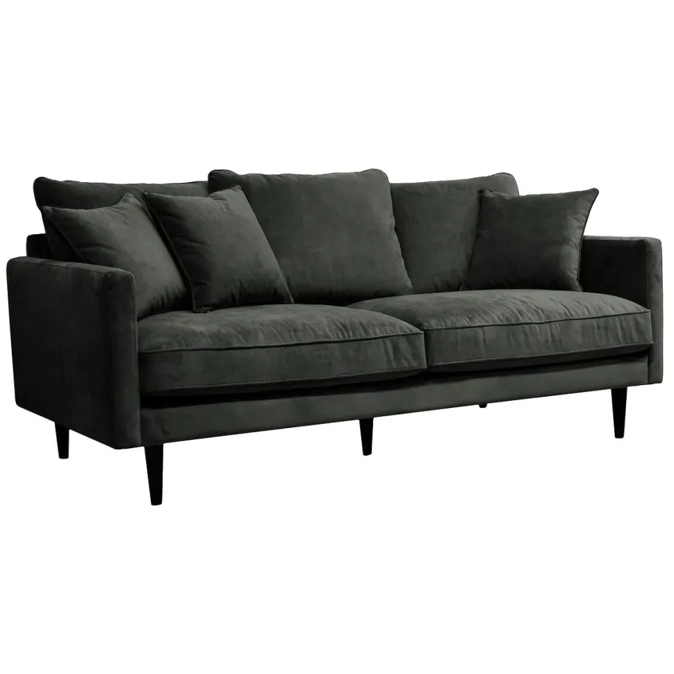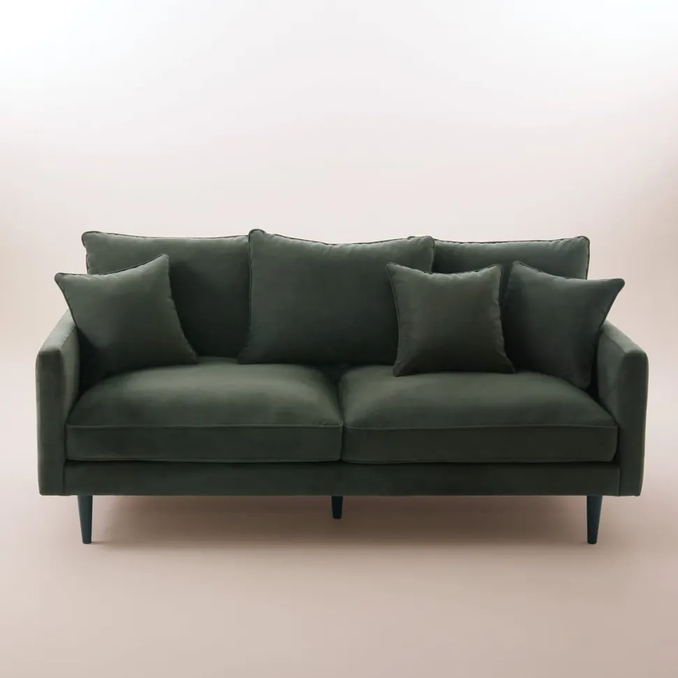 Pozwól sobie na odrobinę luksusu w swoim salonie z aksamitną sofą Candice w kolorze ciemnej zieleni. Ten trzyosobowy mebel łączy w sobie elegancję, komfort i funkcjonalność. Wykończona matowym aksamitem, sofa nie tylko prezentuje się stylowo, ale jest też niezwykle miękka w dotyku i łatwa do utrzymania w czystości. Wysokiej jakości pianka poliuretanowa, z której wykonane jest siedzisko, gwarantuje trwałość i wygodę na lata.