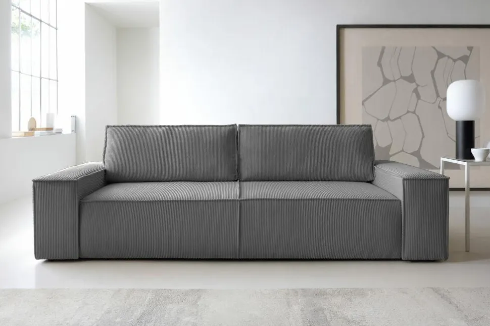 Duże i miękkie poduchy na oparciu oraz grube podłokietniki zapewniają komfort podczas wypoczynku, a także pełnią funkcję praktycznych schowków. Wysoka jakość wykonania oraz trwałość materiałów, takich jak sztruksowa tkanina Poso, czynią tę sofę nie tylko wygodnym, ale także trwałym meblem.