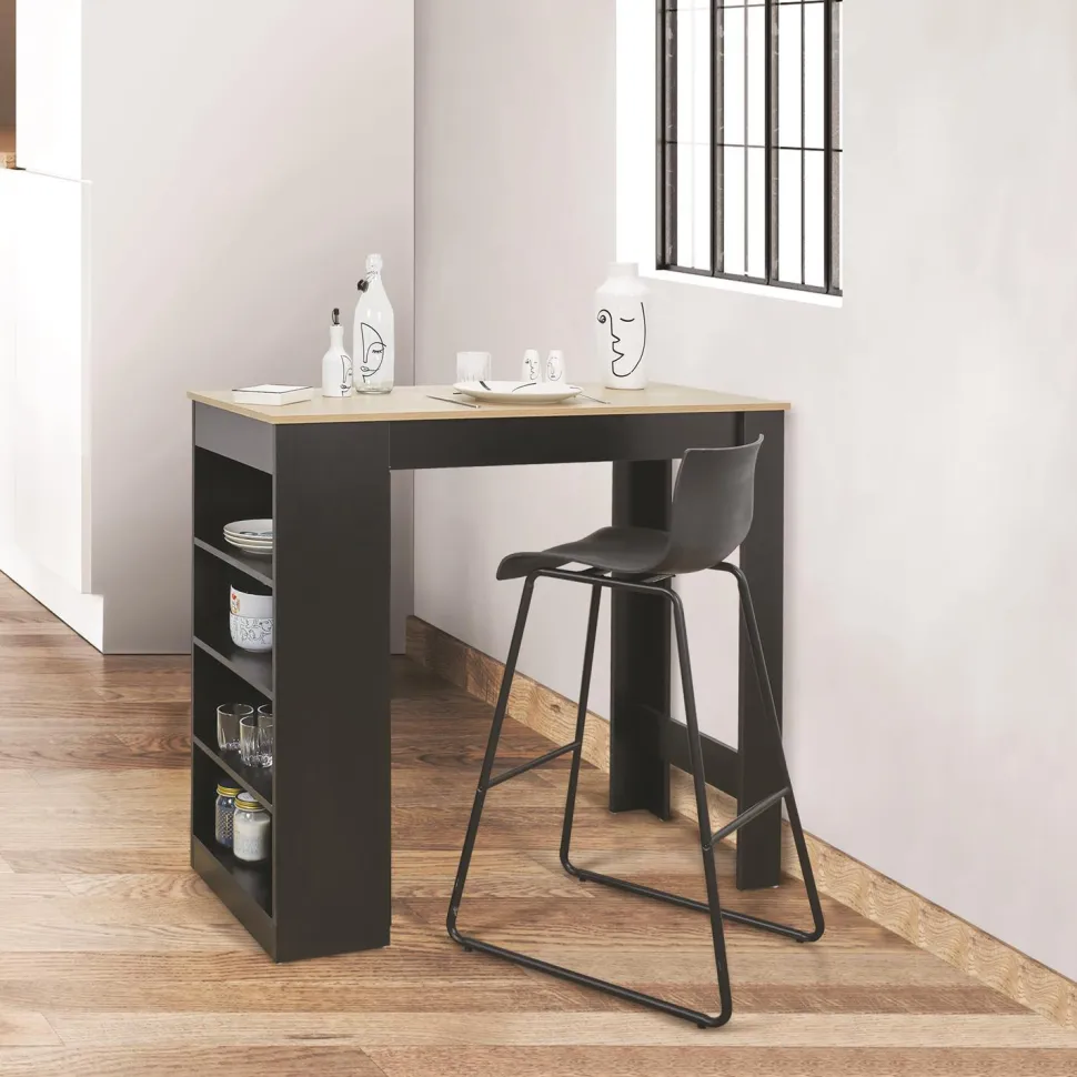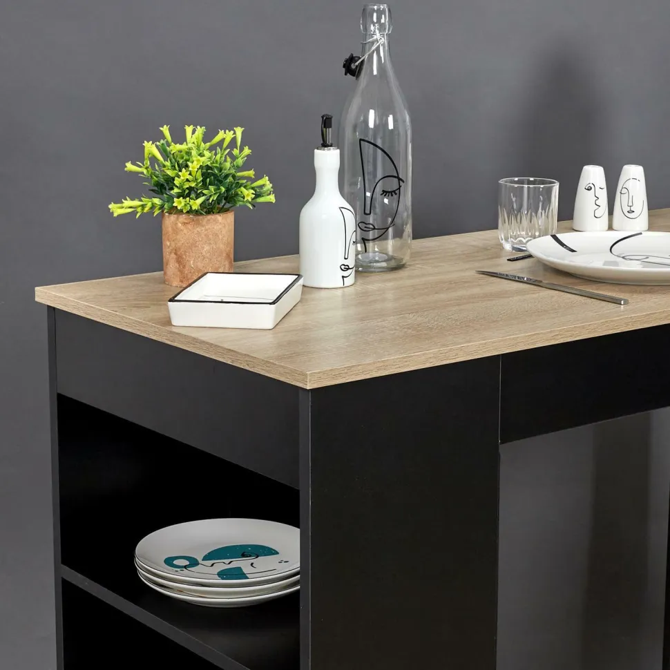 Stół posiada prostokątny blat w kolorze dębowym. Spoczywa on na asymetrycznej konstrukcji w kolorze czarnym. Jedna strona podstawy to dwie połączone u dołu wspornikiem nogi. Druga strona posiada cztery półki, które stanowią dodatkowe miejsce do przechowywania. To świetne miejsce na talerze lub nieduże sprzęty kuchenne.
