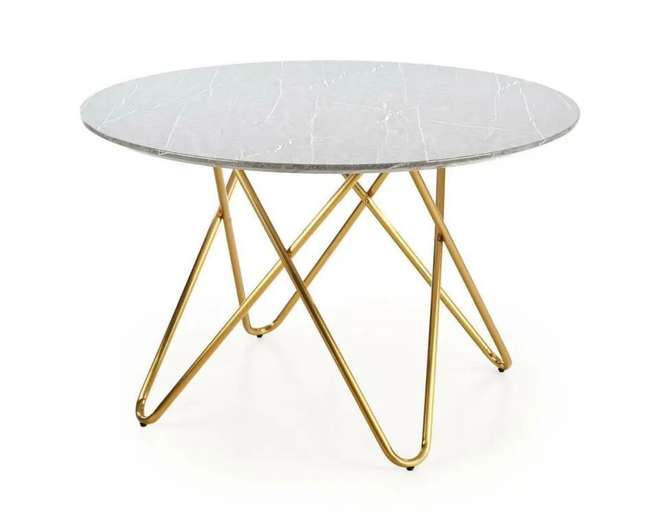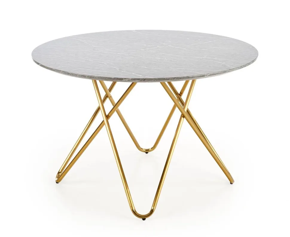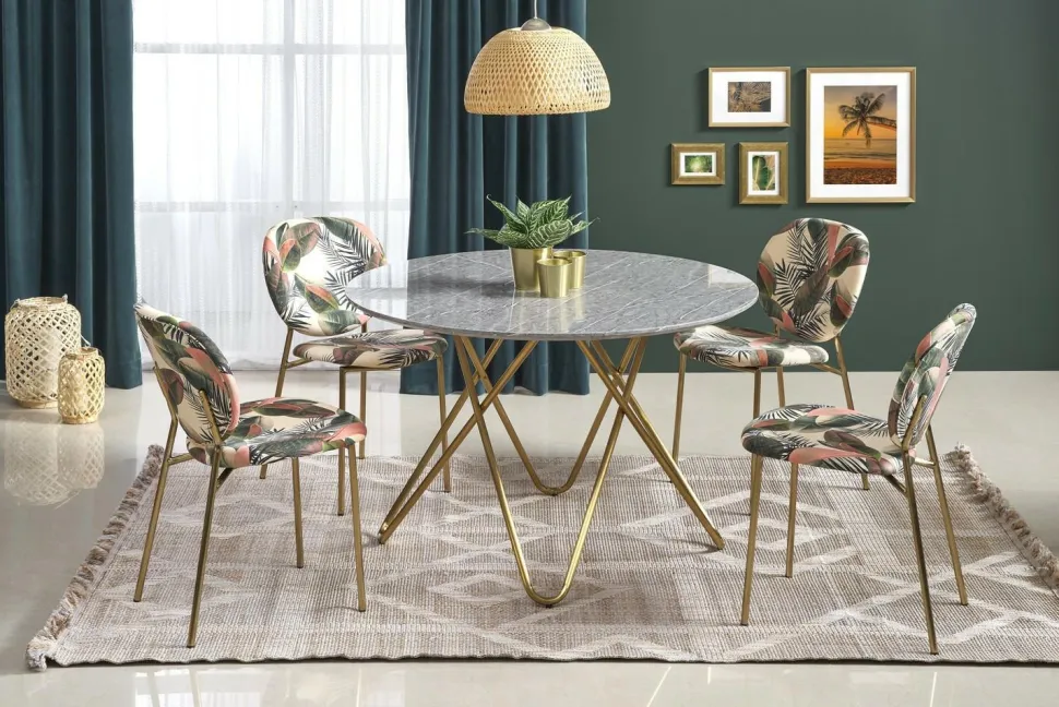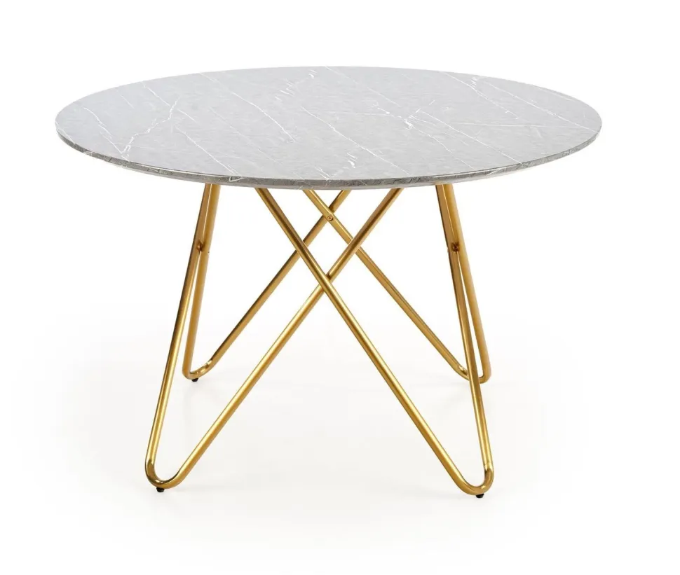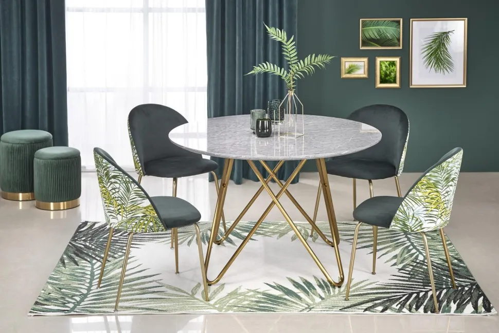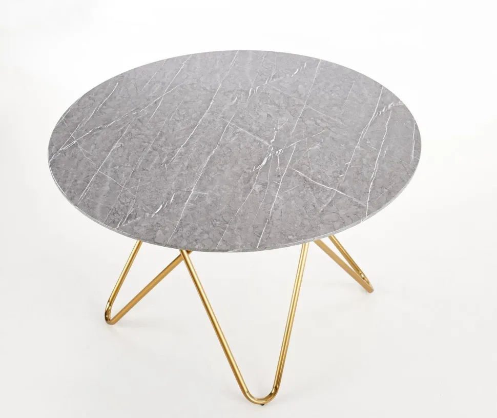 Jego okrągły blat o wymiarach 120/76 cm w kolorze popielatego marmuru jest wystarczająco duży, aby pomieścić 6 osób, co czyni go idealnym wyborem dla rodzinnych obiadów lub spotkań z przyjaciółmi. Nie musisz się martwić o rozkładanie blatu, ponieważ jest on stały i nie wymaga dodatkowego montażu.