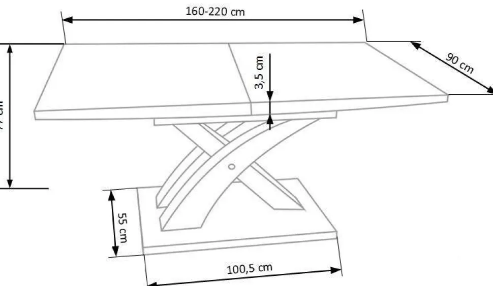Odważny styl z rozkładanym stołem Doran. Ten nowoczesny stół ma efektowny blat z płyty MDF i solidne nogi ze stali nierdzewnej dla dodatkowej stabilności. Wymiary wynoszą 160-220 cm (dł.), 90 cm (szer.) i 77 cm (wys.).
