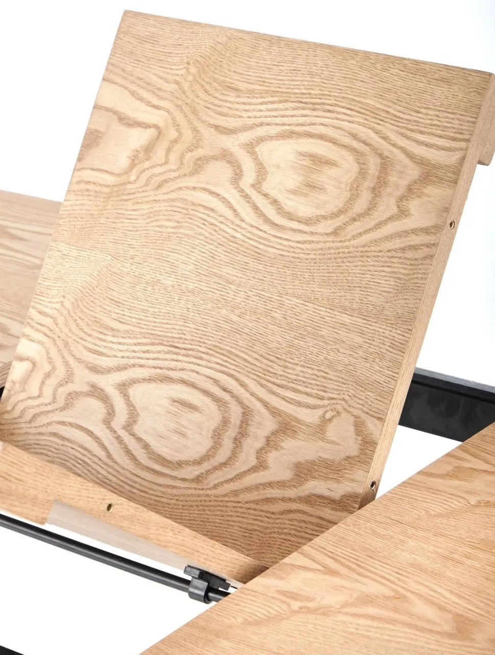 Stół wykonany jest z wysokiej jakości materiałów, takich jak MDF i okleina naturalna, co gwarantuje jego trwałość i długowieczność. Blat w kolorze dębu naturalnego dodaje mu eleganckiego wyglądu, a nogi w kolorze czarnym nadają mu nowoczesnego i loftowego charakteru. To idealne połączenie stylów, które sprawi, że Twój stół będzie wyglądał pięknie w każdym wnętrzu. Jego prostokątny kształt i wysokość 75 cm zapewniają wygodne użytkowanie, a możliwość rozkładania sprawia, że jest to mebel niezwykle funkcjonalny.