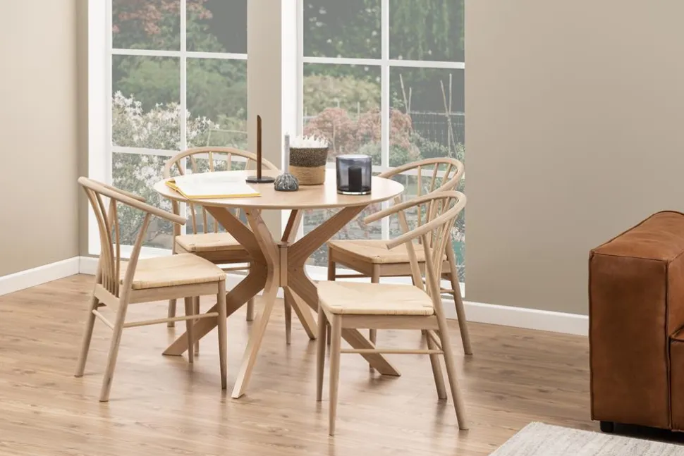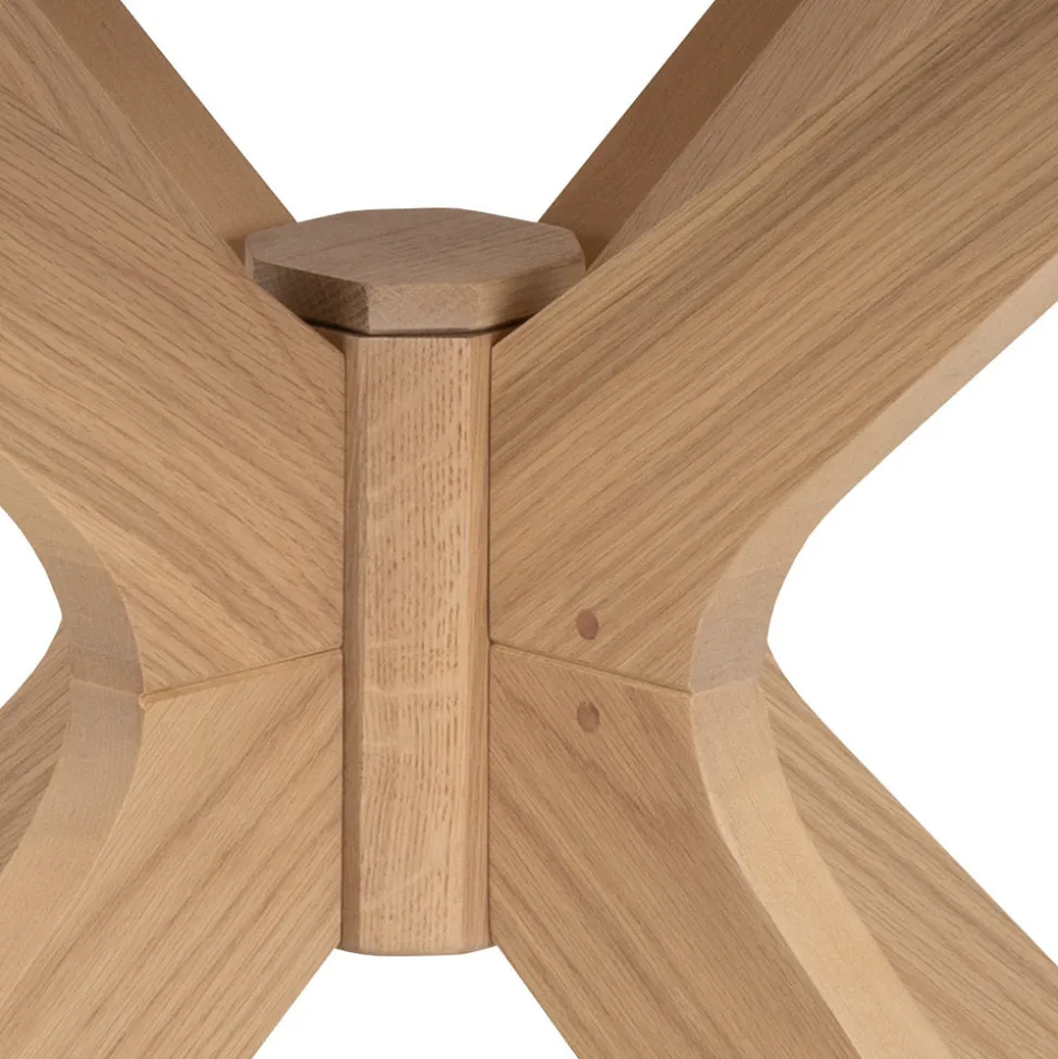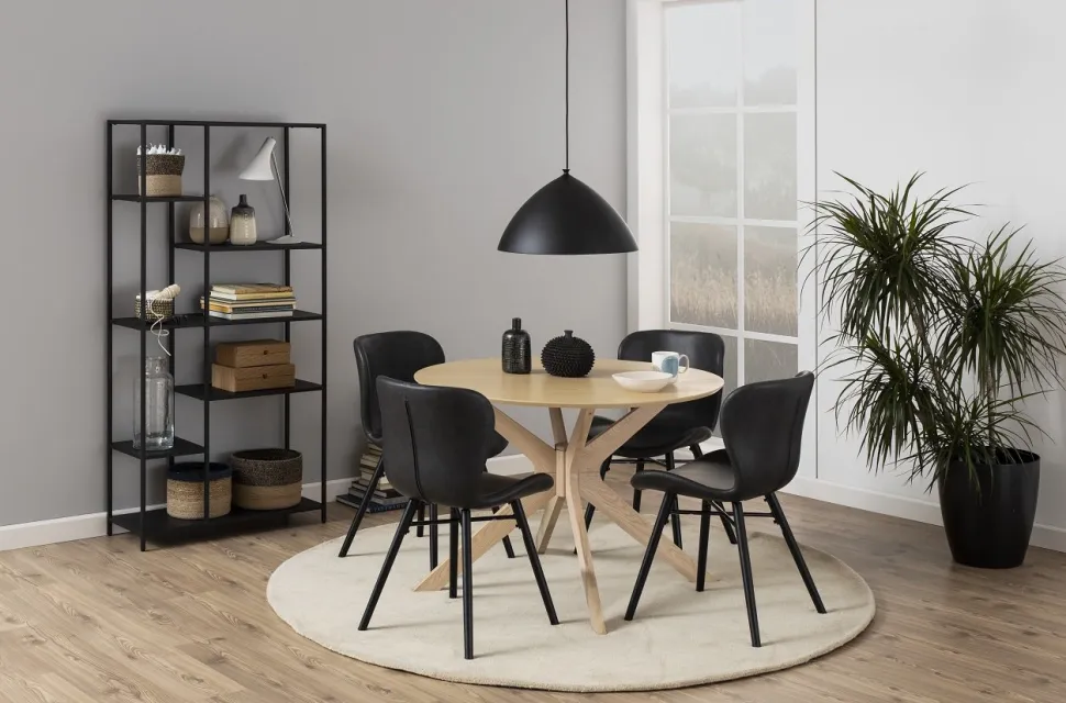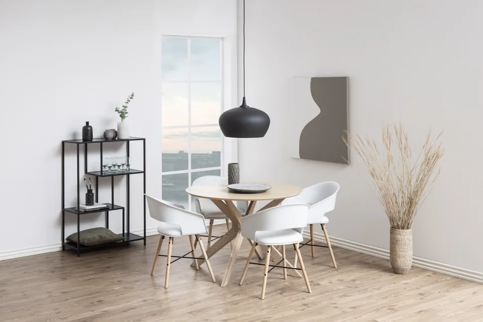 - Blat stołu wykonany jest z płyty MDF, natomiast podstawa z forniru dębowego – to połączenie materiałów zapewnia stabilność i trwałość mebla.