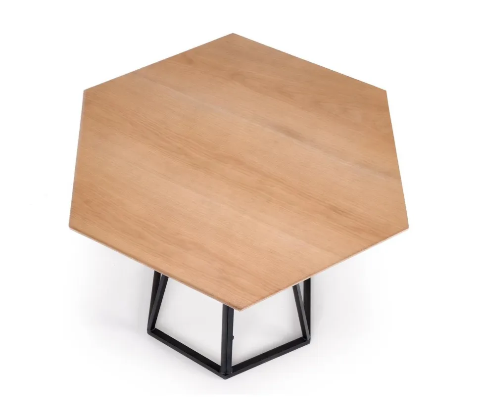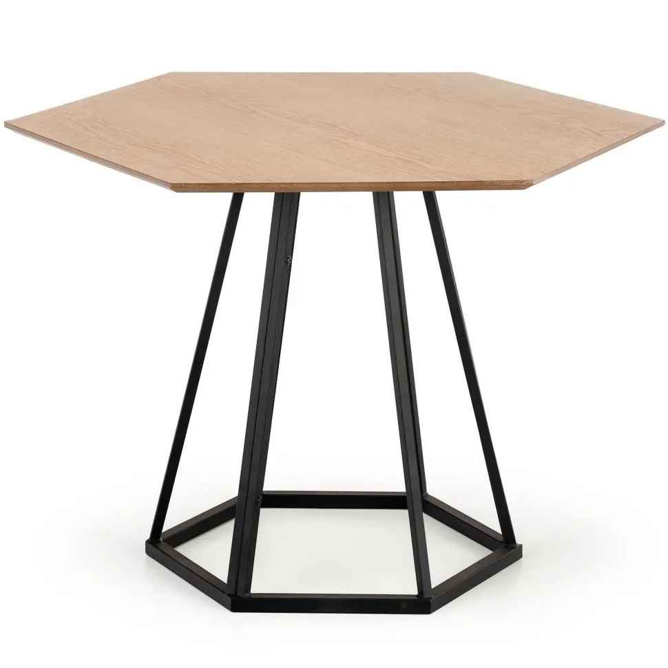 Stół Hexis to mebel o wyjątkowym designie i funkcjonalności. Jego sześcioboczny blat o wymiarach 110 cm wykonany z MDF z okleiną w kolorze naturalnym nadaje mu naturalnego uroku i elegancji. Noga stołu, wykonana z malowanej proszkowo stali, ma kolor czarny, co tworzy kontrastujące połączenie kolorów.