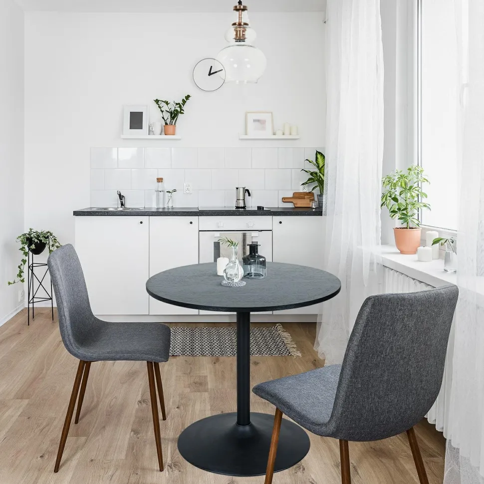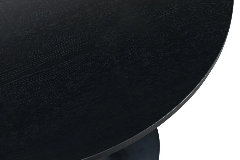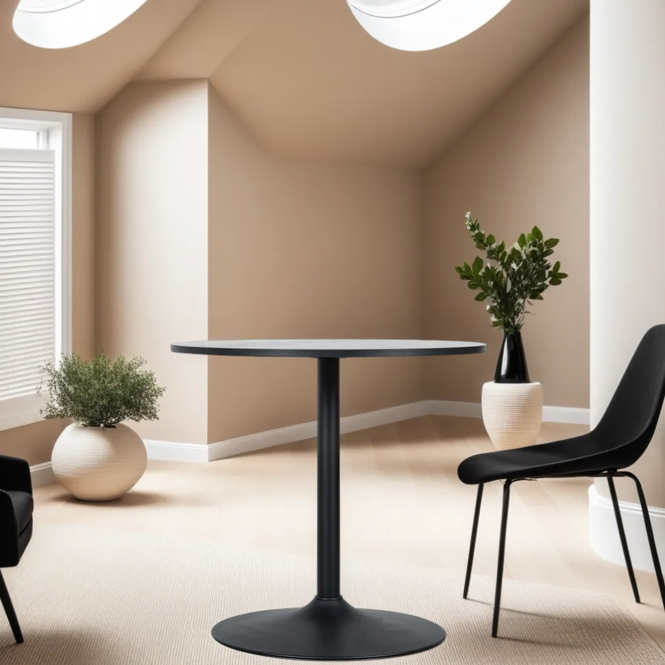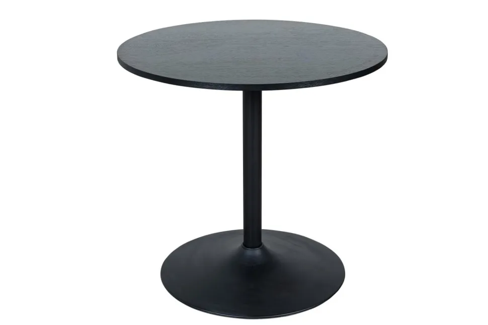 Elegancki i funkcjonalny stół idealny do wnętrz w stylu loftowym lub modern glamour. Czarny stół wykonany ze stabilnej nogi o kształcie trąbki i półmatowym wykończeniu, stanie się ozdobą każdej przestrzeni. Okrągły blat o średnicy 80 cm wykonany jest z trwałej płyty MDF, oklejonej okleiną imitującą słoje drewna, co nadaje mu naturalny i ponadczasowy wygląd. Blat o grubości 2 cm zapewnia solidność i elegancję.Idealnie sprawdzi się w niewielkiej kuchni lub salonie, gdzie doda charakteru i stylu. Jego kompaktowe wymiary czynią go również doskonałym wyborem do kawiarni lub restauracji, gdzie połączy funkcjonalnośćstołuna jednej nodze z ciekawym i minimalistycznym wyglądem. Stół ten to połączenie nowoczesności i loftowego uroku, które zadowoli nawet najbardziej wymagających klientów.