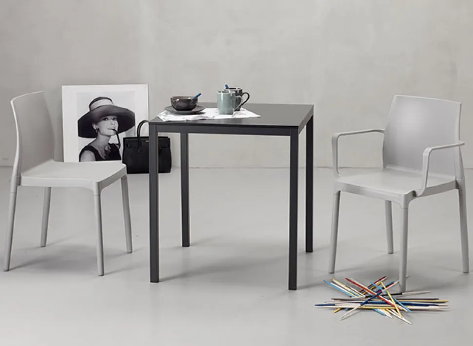 Stół Mirto w kolorze antracytowym topołączenie elegancji, nowoczesności i funkcjonalności. Zapewniając kompaktowąlaminowaną powierzchnię blatu, doskonale komponuje się z ocynkowaną malowaną stalową konstrukcją, co nadaje mu wyjątkowego charakteru.