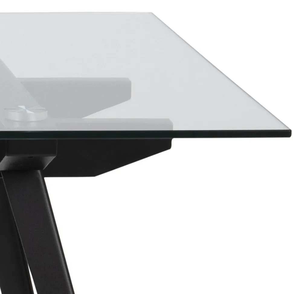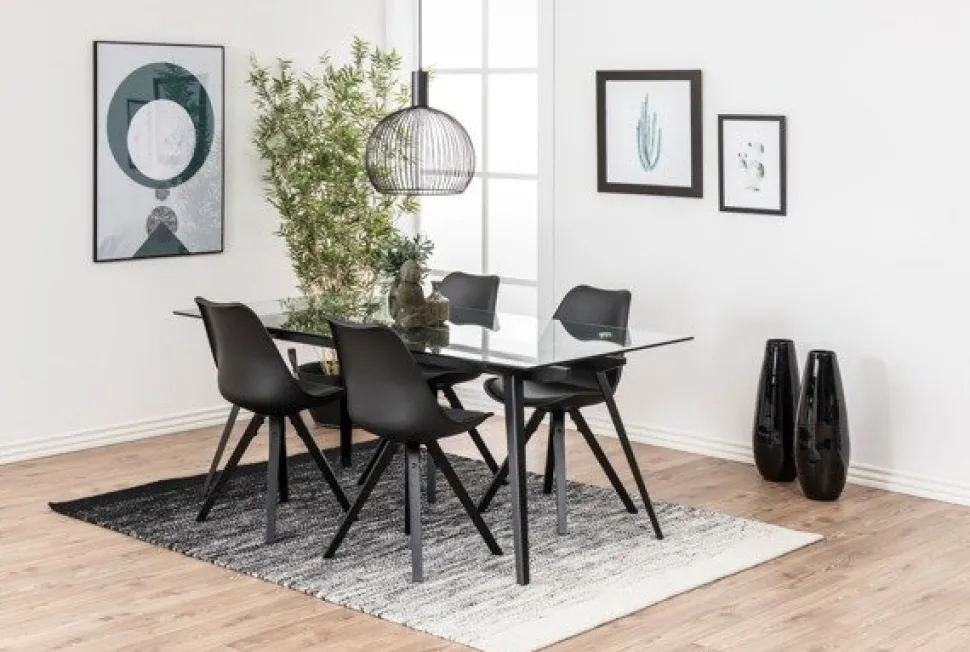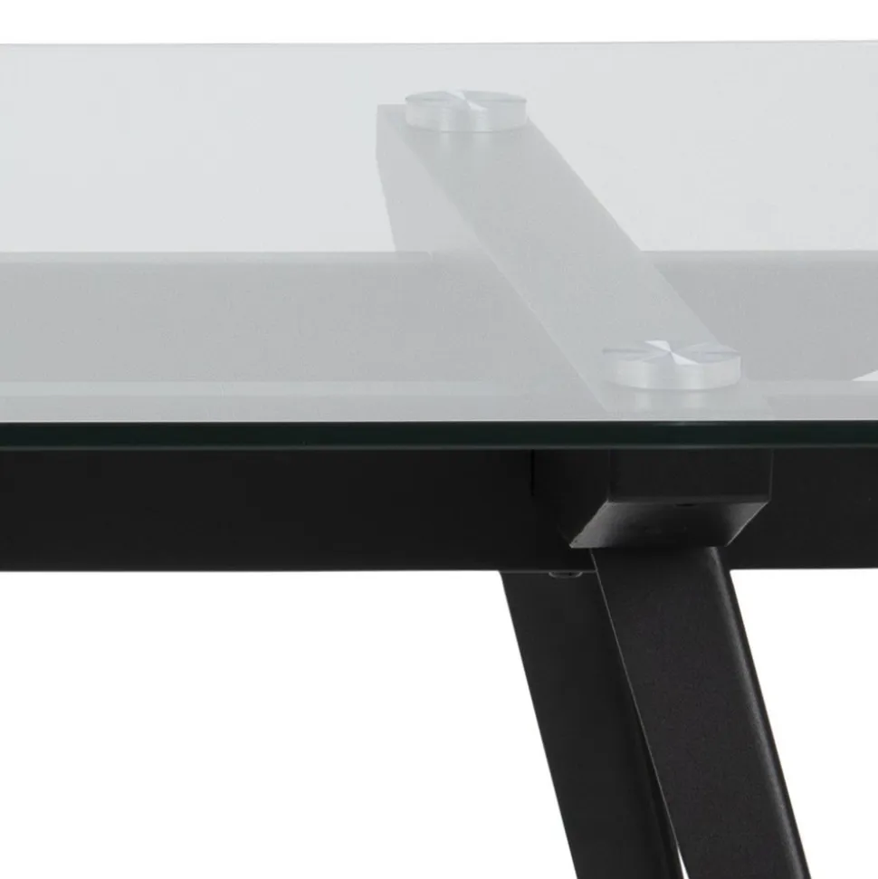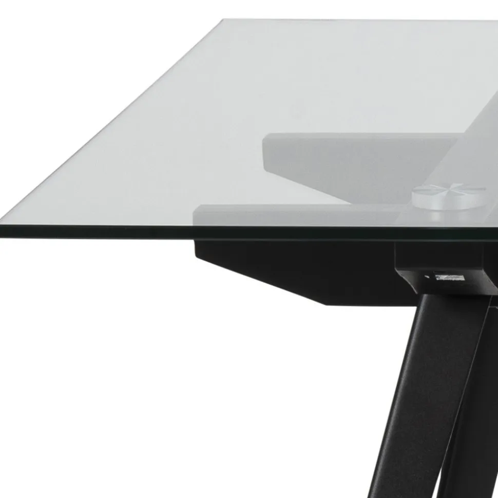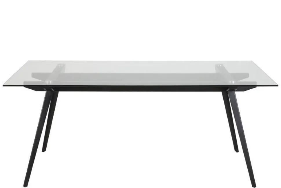 Nowoczesny stolik Monti o oryginalnej konstrukcji będzie eleganckim dodatkiem do każdego wnętrza. Podstawa stolika wykonana jest ze stali polakierowanej na czarno. Zwężające się ku dołowi nogi są dość szeroko rozstawione. U góry nogi połączone są czterema belkami, z których dwie są ułożone ukośnie i mają ścięte końce. Kształt konstrukcji nadaje stołowi orientalnego charakteru. Blat stołu wykonany jest z hartowanego szkła i podpierają go cztery okrągłe metalowe podkładki widoczne przez szybę. Formalny stół znakomity do części jadalnianej w salonie lub nowoczesnej kuchni.