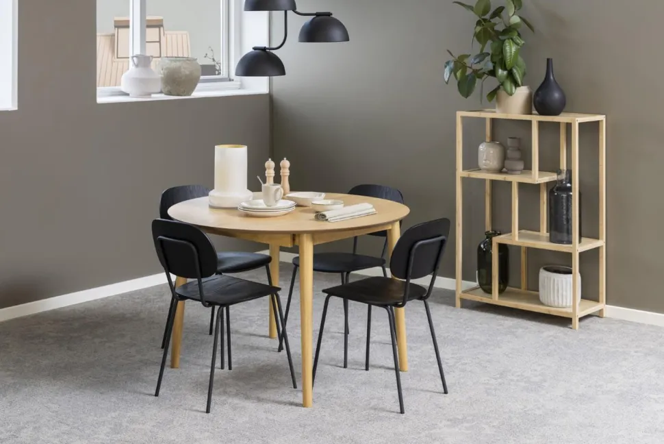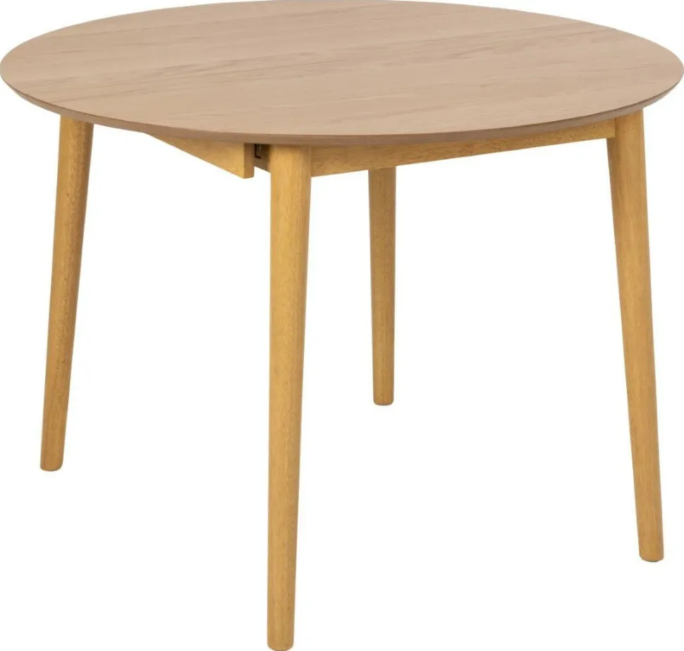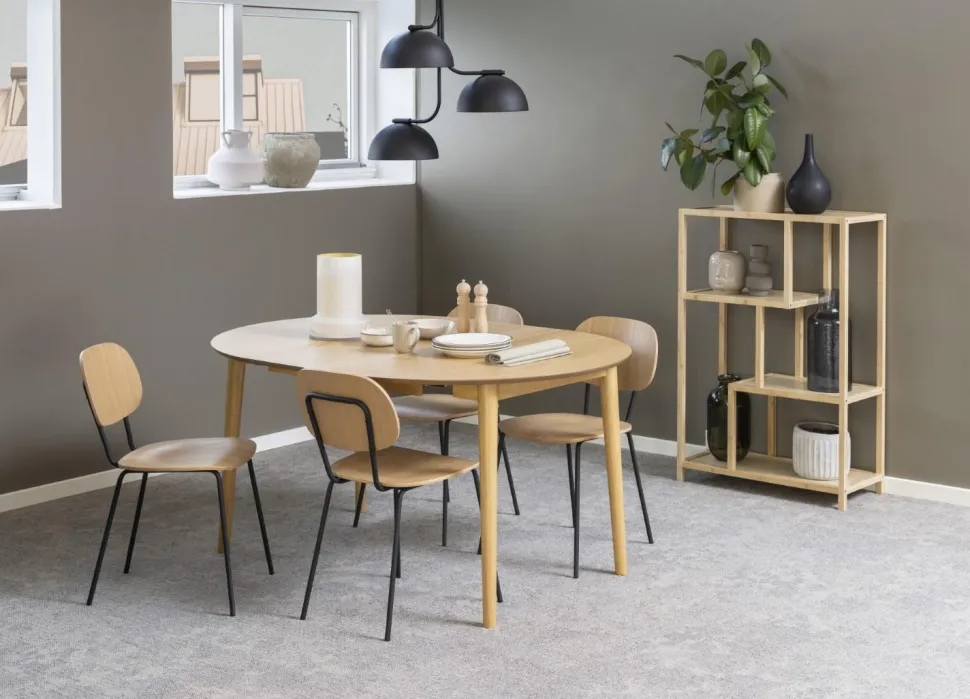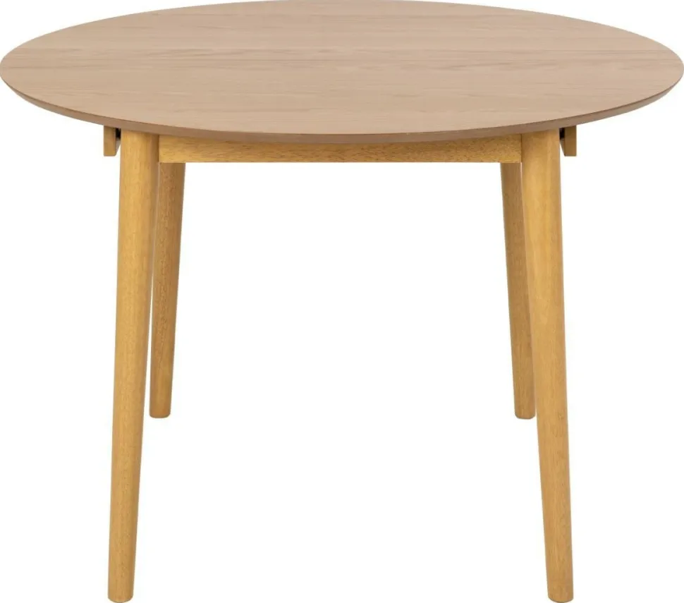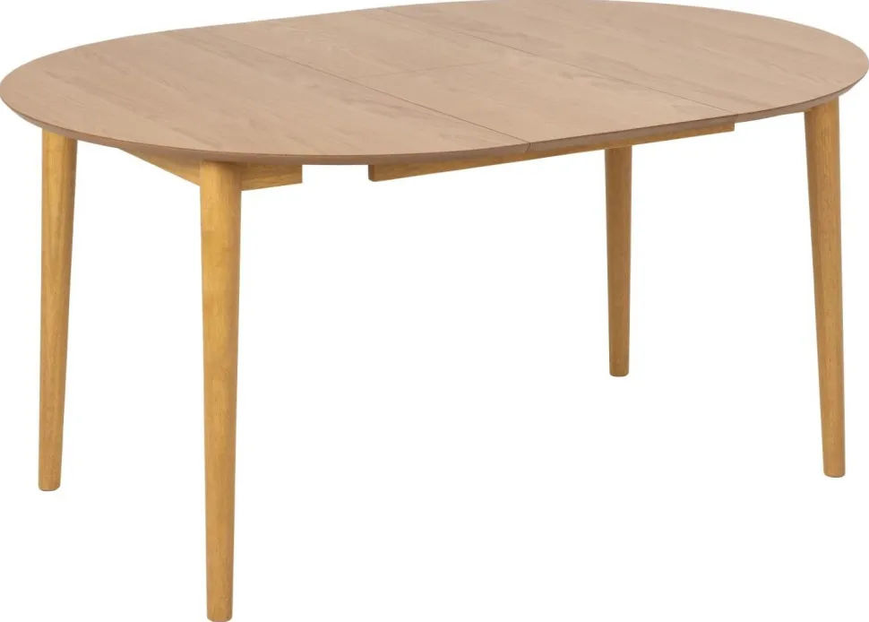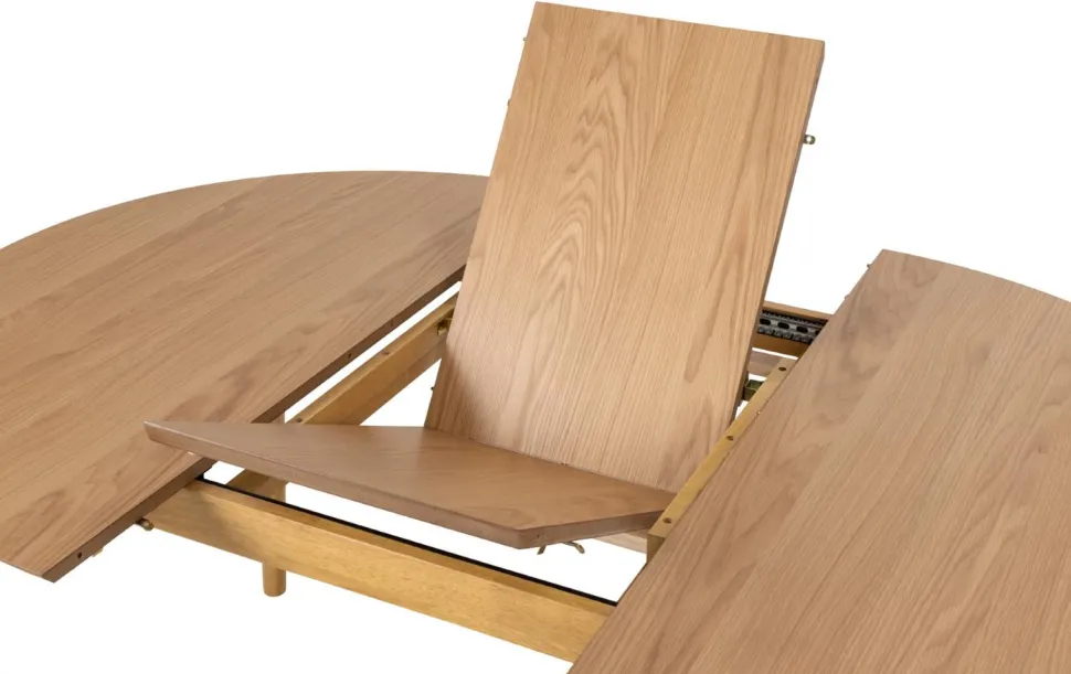 Stół Montreux jest w całości wykonany z drewna. Ma duży, okrągły blat pokryty fornirem z drewna dębu, w naturalnym odcieniu. Jest to z pewnością jego duży atut, ponieważ ten materiał charakteryzuje się niezwykłą wytrzymałością. Dodatkowo jest łatwy do utrzymania w czystości, do jego pielęgnacji wystarczy jedynie miękka ściereczka z wodą. Rogi blatu są ładnie zaokrąglone, a jego brzeg lekko ścięty, nadając mu łagodny, organiczny wygląd. Podstawa wykonana jest z drewna kauczukowego pobejcowanego na dębowy kolor dopasowany do blatu. Zaletą Montreuxa jest rozsuwany blat. Pod blatem głównym znajdują się blaty powiększające stół do szerkości 154 cm.