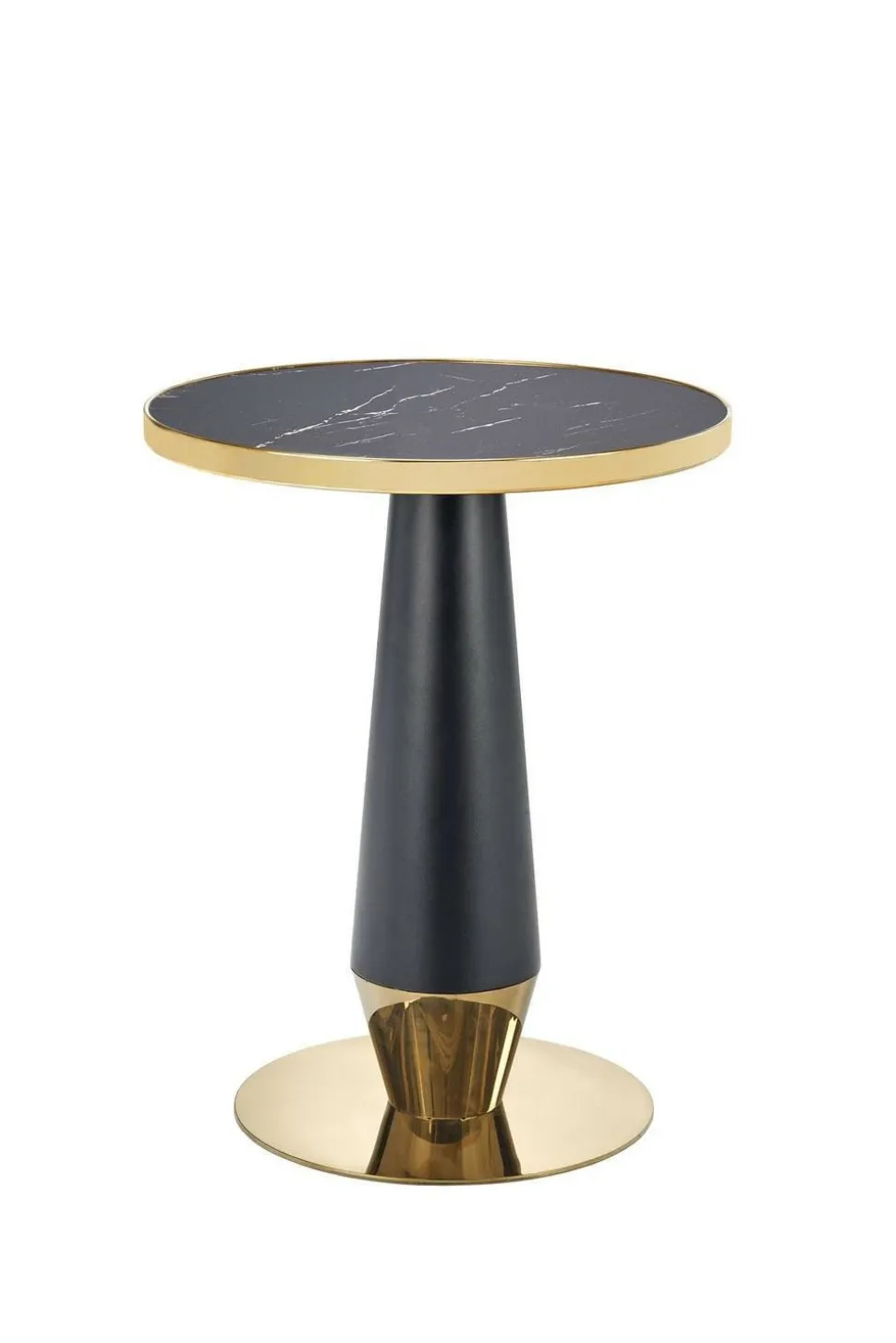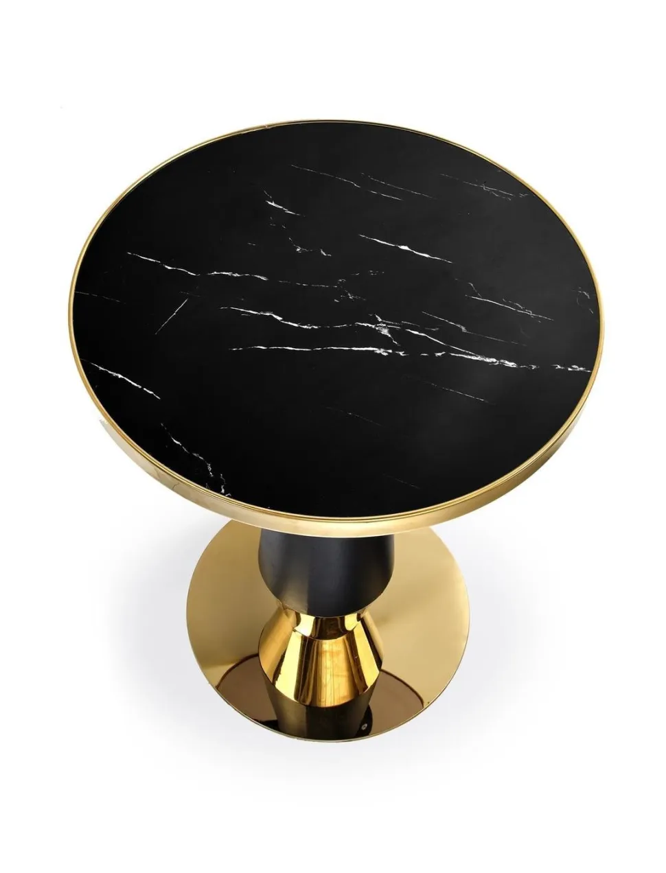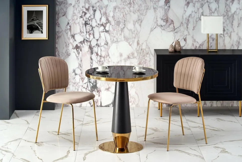 Blatstołuw kolorze czarnego marmuru dodaje mu eleganckiego wyglądu, który z pewnością przypadnie do gustu każdemu miłośnikowi stylowego designu. Noga w kolorze czarnym lub złotym dodaje jeszcze więcej klasy i stylu, dzięki czemu ten stół będzie idealnym wyborem do Twojego wnętrza.Nie tylko wygląd, ale również funkcjonalność jest godna uwagi. Okrągły kształt blatu zapewnia wygodne miejsce do spożywania posiłków lub picia kawy, a jedna noga zapewnia stabilność i wytrzymałość.