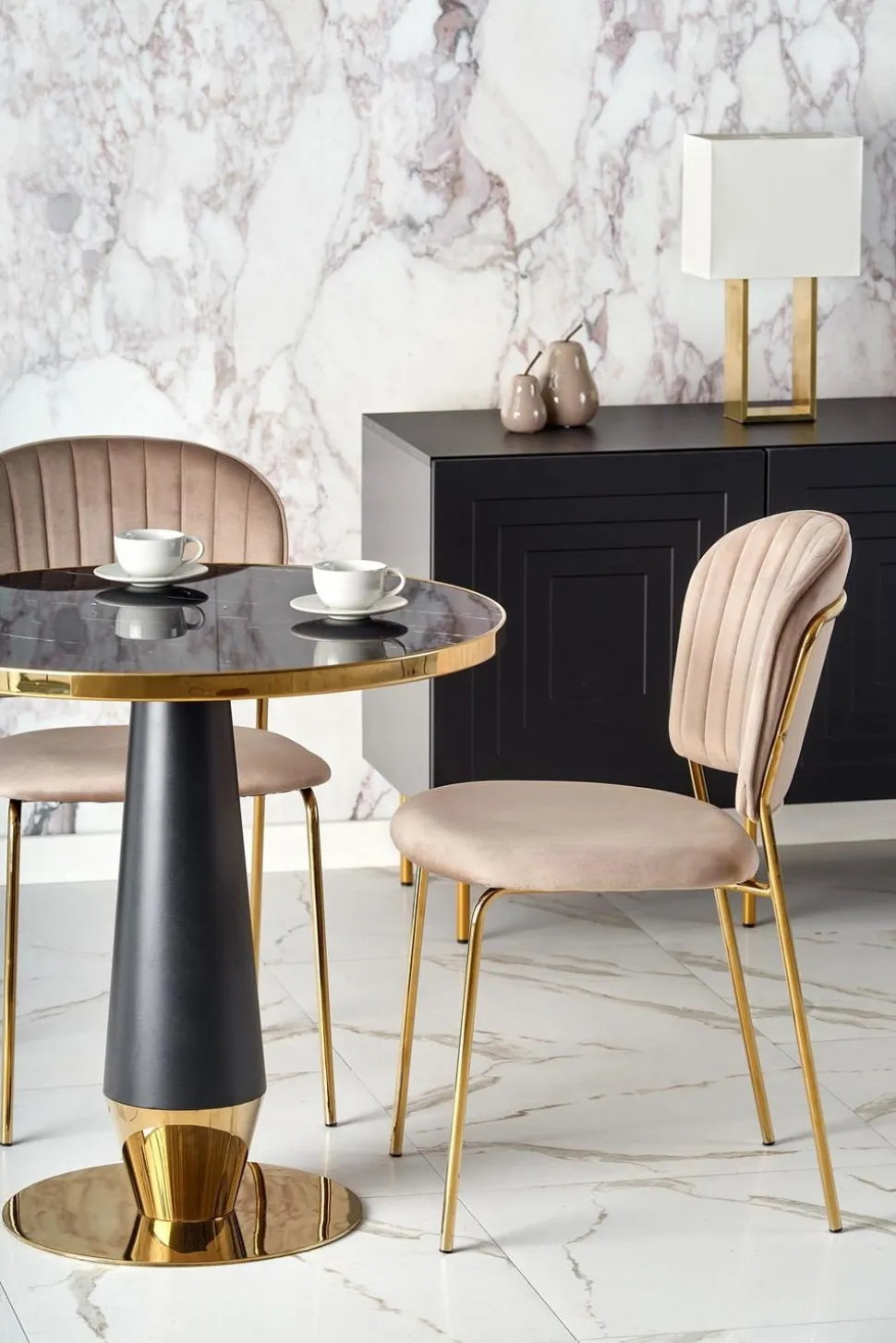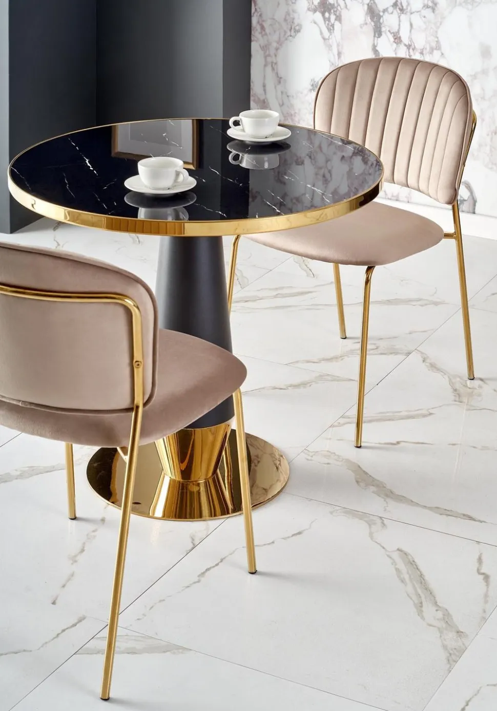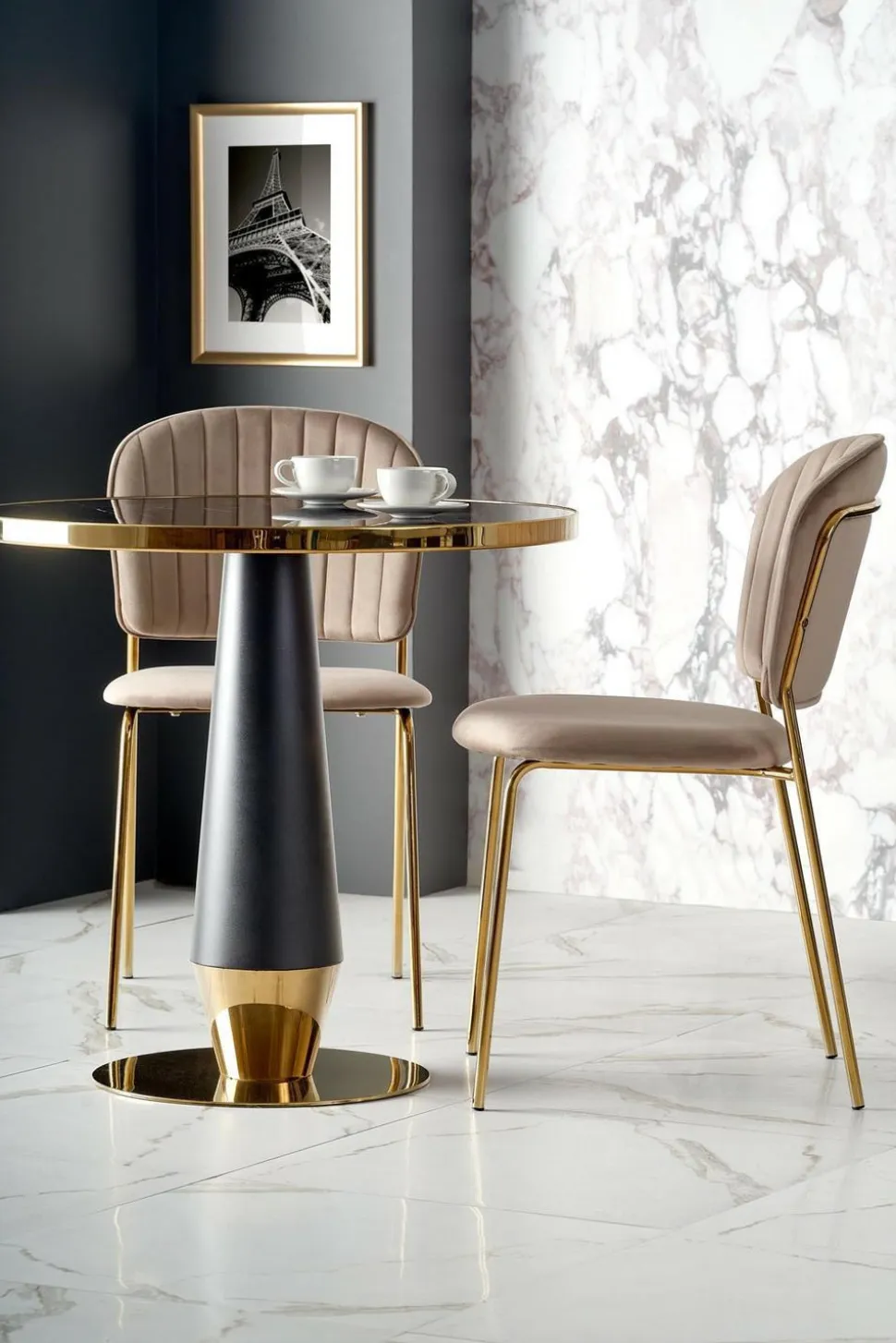 Blatstołuw kolorze czarnego marmuru dodaje mu eleganckiego wyglądu, który z pewnością przypadnie do gustu każdemu miłośnikowi stylowego designu. Noga w kolorze czarnym lub złotym dodaje jeszcze więcej klasy i stylu, dzięki czemu ten stół będzie idealnym wyborem do Twojego wnętrza.Nie tylko wygląd, ale również funkcjonalność jest godna uwagi. Okrągły kształt blatu zapewnia wygodne miejsce do spożywania posiłków lub picia kawy, a jedna noga zapewnia stabilność i wytrzymałość.