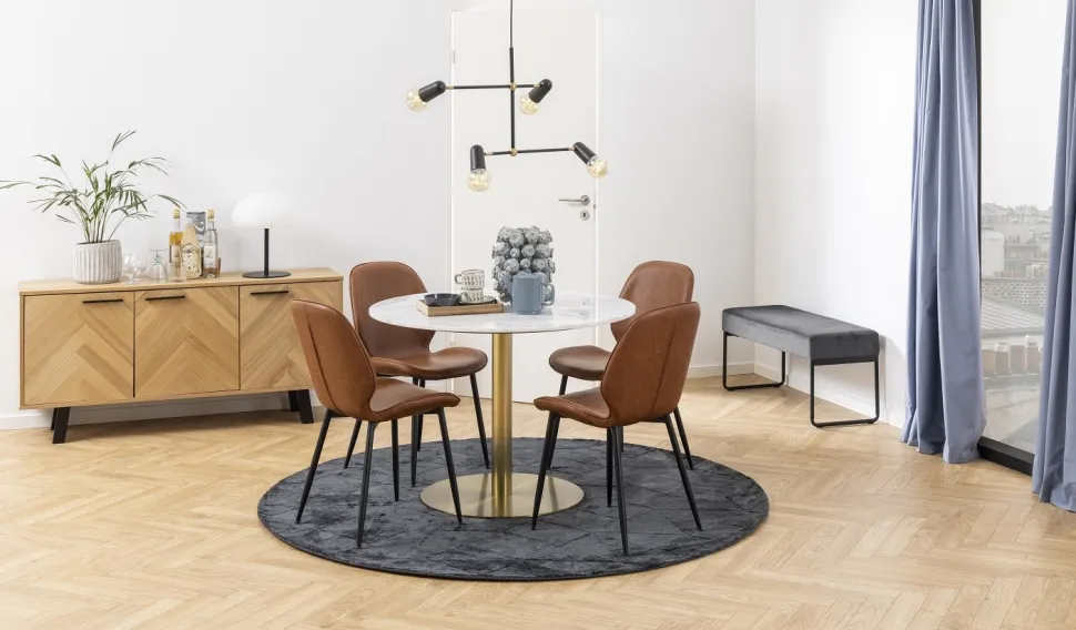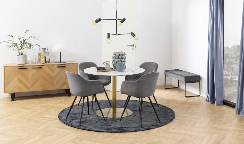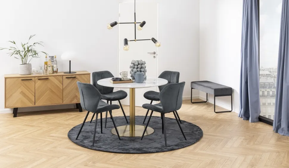 Stół okrągły z marmurowym blatem wykonanym z białego marmuru połączony został ze szczotkowanym metalem w kolorze złotym. Niezwykłe połączenie sprawia, że stół jest niezwykle elegancki oraz efektowny. Sprawdzi się zarówno w modernistycznej kuchni, ekstrawaganckim holu hotelu czy eleganckiej restauracji. Styl Glamour w połączeniu z nowoczesnością sprawia, że mebel ten prezentuje się wyjątkowo.