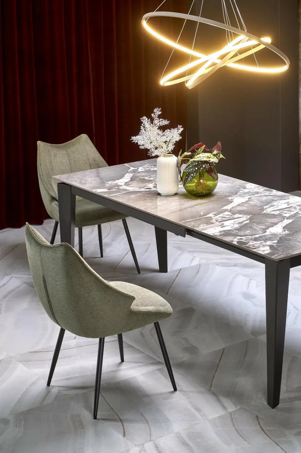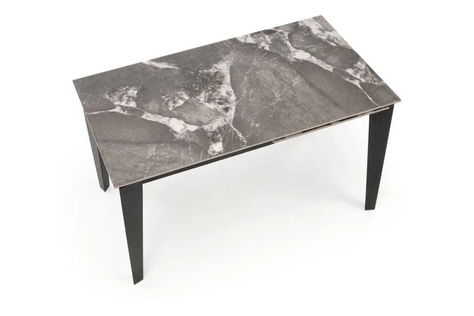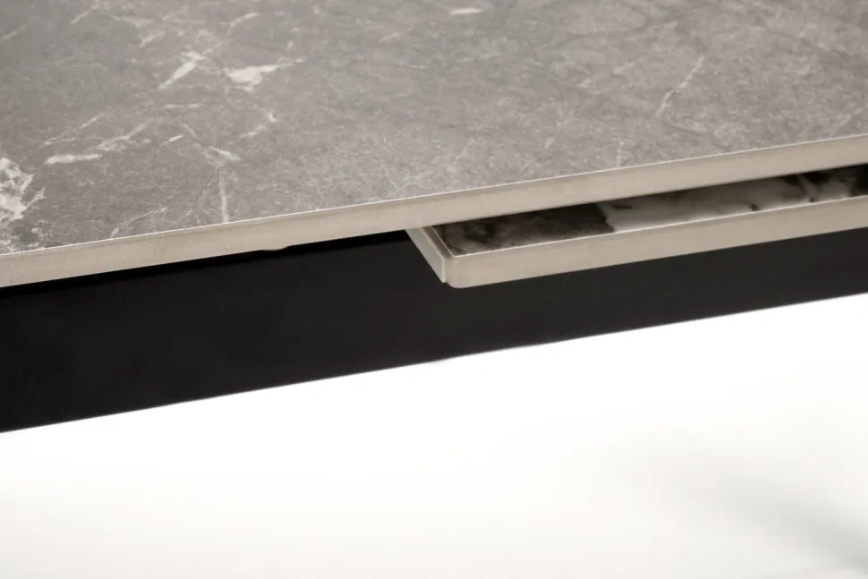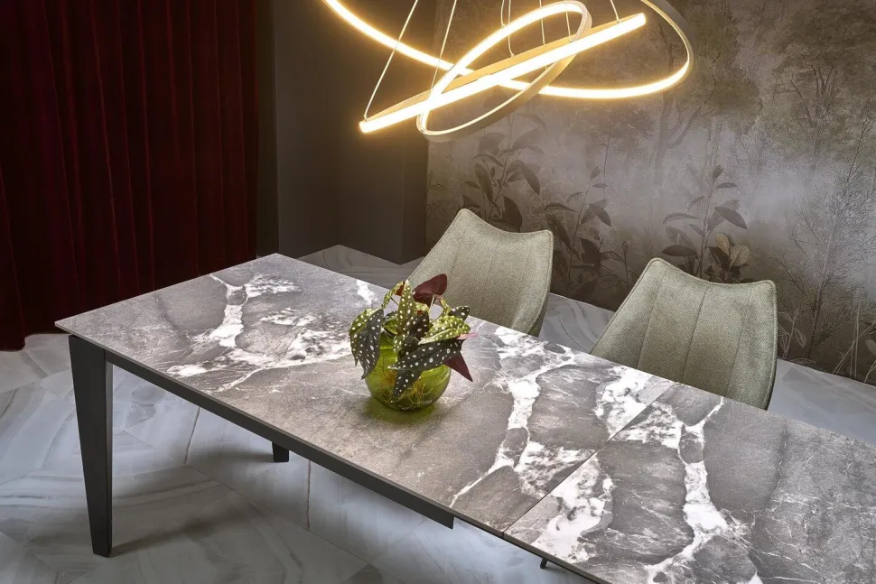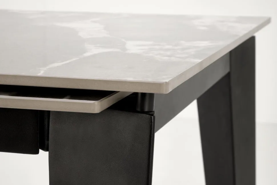 Stół rozkładany Asniki to doskonały wybór dla miłośników nowoczesnego designu połączonego z funkcjonalnością. Jego elegancki wygląd przyciąga wzrok, a solidna konstrukcja zapewnia stabilność i wytrzymałość na lata. Cztery czarne, stalowe nogi nadają mu wyjątkowego charakteru, harmonijnie komponując się z popielatym, marmurowym blatem. Blat ze spieku, imitujący wzorzysty popielaty marmur, dodaje stołu prestiżu i luksusu, dzięki czemu staje się on centralnym punktem każdego wnętrza.