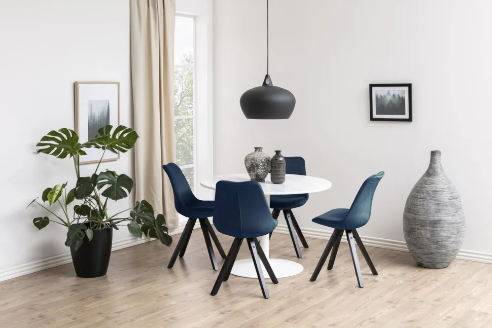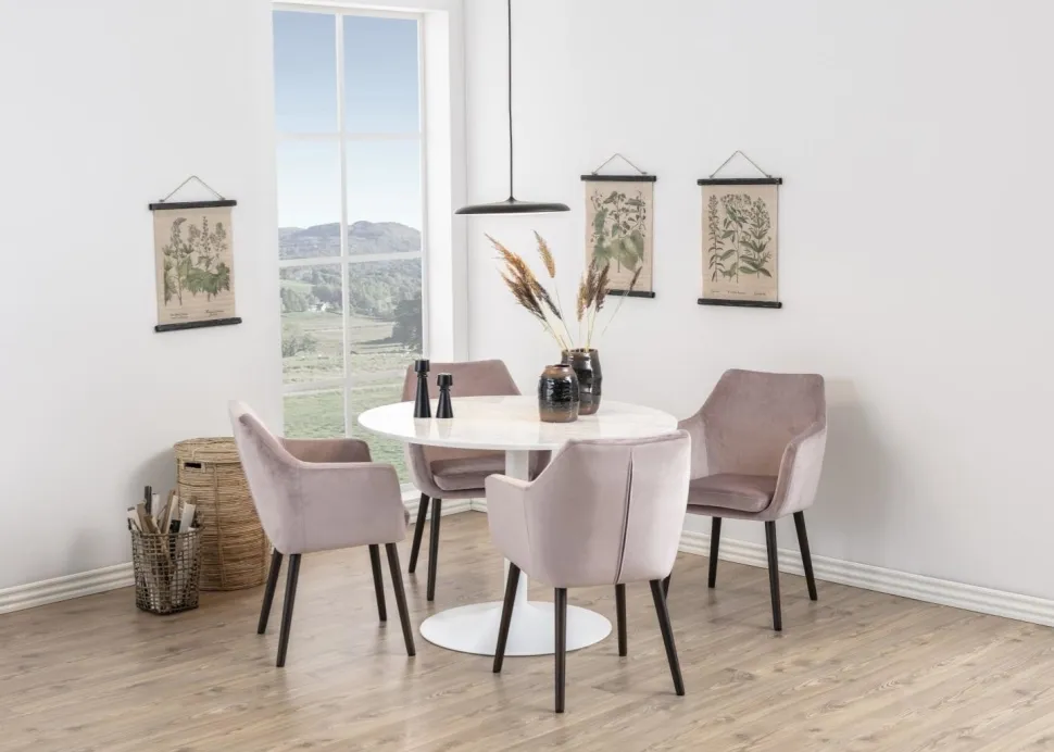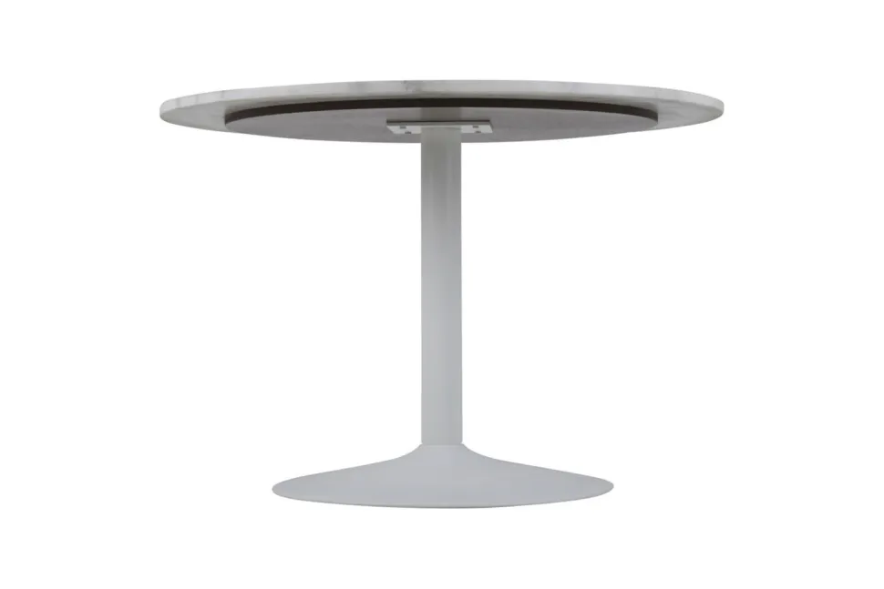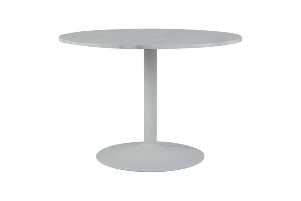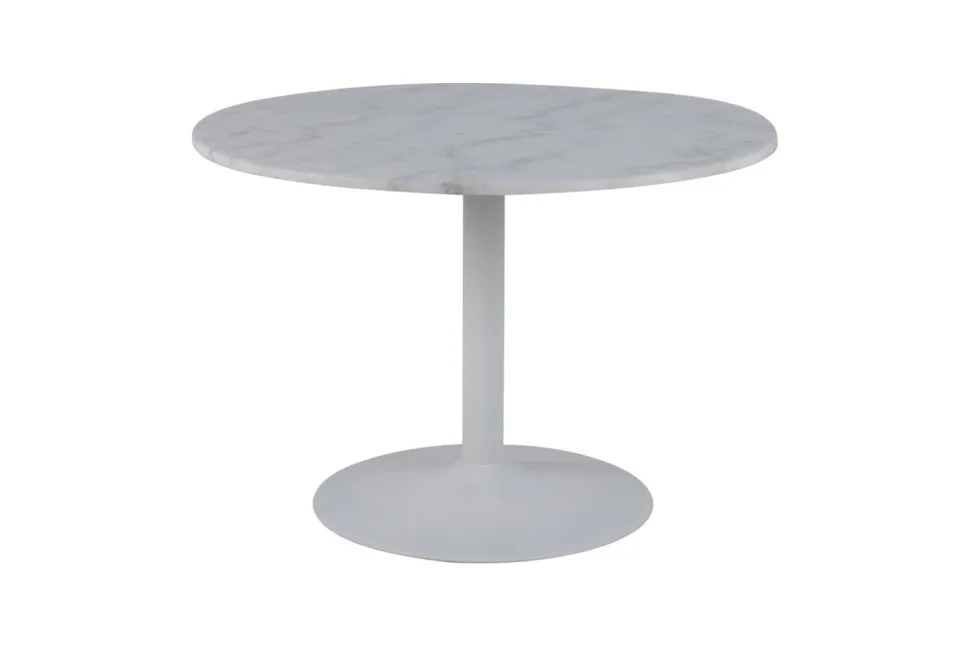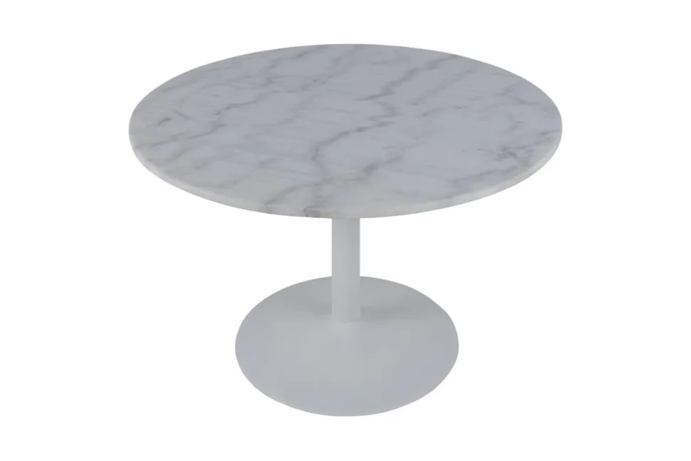 Stół okrągły z marmurowym blatem wykonanym z białego marmuru Guangxi połączony został z metalową matową podstawa w kolorze białym. Niezwykłe połączenie sprawia, że stół jest niezwykle elegancki oraz efektowny. Sprawdzi się zarówno w modernistycznej kuchni, ekstrawaganckim holu hotelu czy eleganckiej restauracji. Styl Glamour w połączeniu z nowoczesnością sprawia, że mebel ten prezentuje się wyjątkowo. Waga: 71,3 kg.