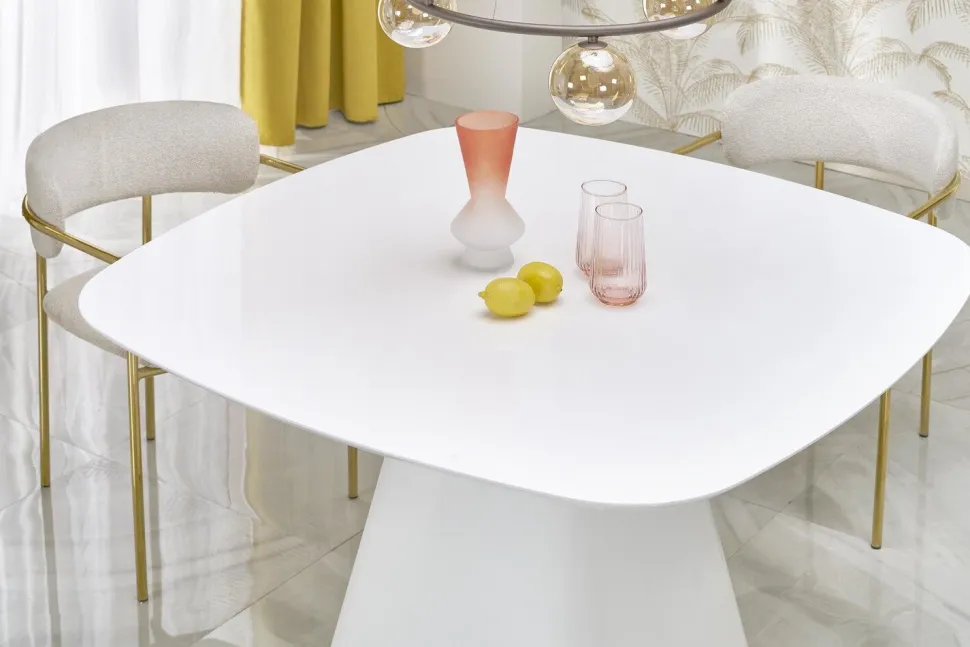 - Wykonany z białej płyty MDF, stół jest lekki, elegancki i łatwy w utrzymaniu.