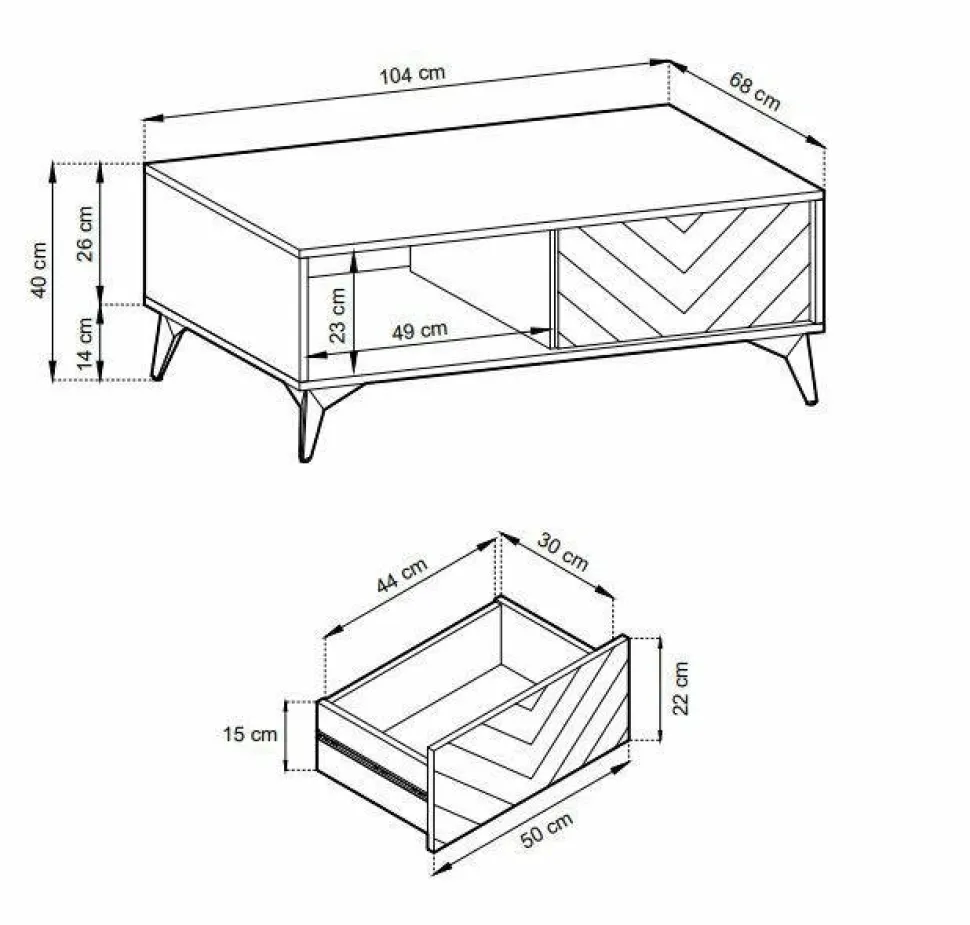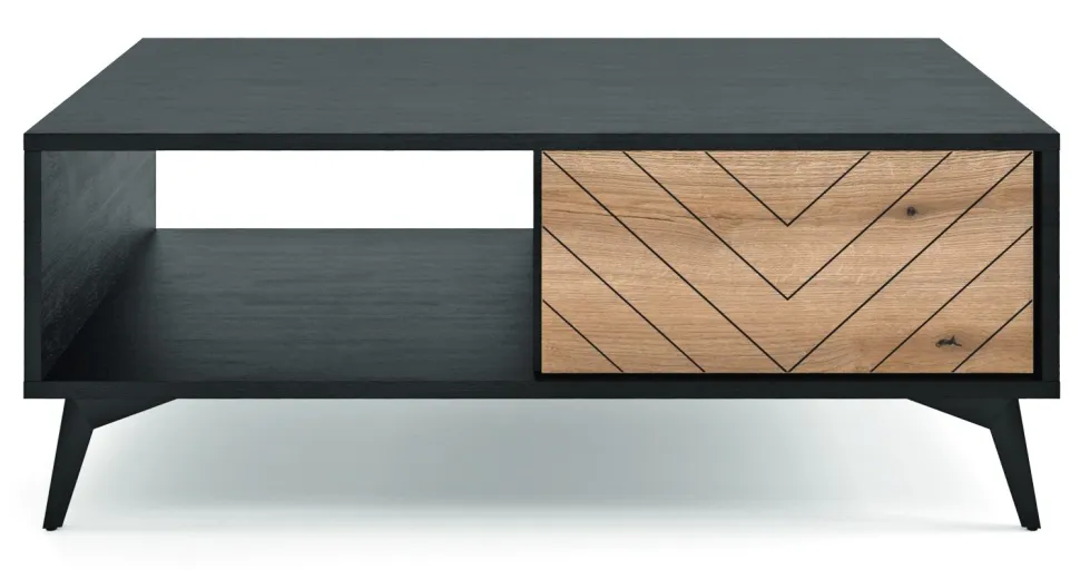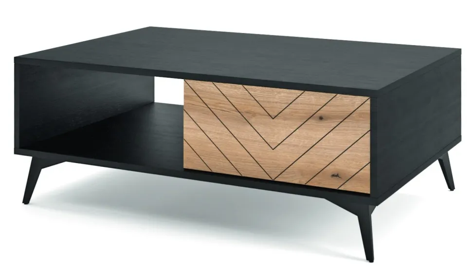 Loftowa stolik na wysokich nóżkach oraz z frontem szuflady w jodełkę to sprawdzony przepis na centralne miejsce w salonie lub sypialni. Seria mebli Fargo to połączenie czarnego korpusu mebla z frontami w kolorze dębu. Dodatkowe frezowanie w kształcie jodełki to element, który odróżnia serię Fargo od zwykłych loftowych mebli.Do produkcji mebli wykorzystana została wytrzymała płyta meblowa zabezpieczona okleiną imitującą naturalne drewno. Meble z serii Fargo nie posiadają standardowych uchwytów, a otworzyć możemy je dzięki wygodnej funkcji push to open. Za pomocą naciśnięcia na front, mebel lekko się otwiera. Podstawą stolika są metalowe nogi o zwężającej się budowie i zarazem o konstrukcji lekko rozszerzającej się na zewnątrz.Wymiary opakowania: 20x20x15cm,111x73x8cm, Waga: 1,5kg 28kg