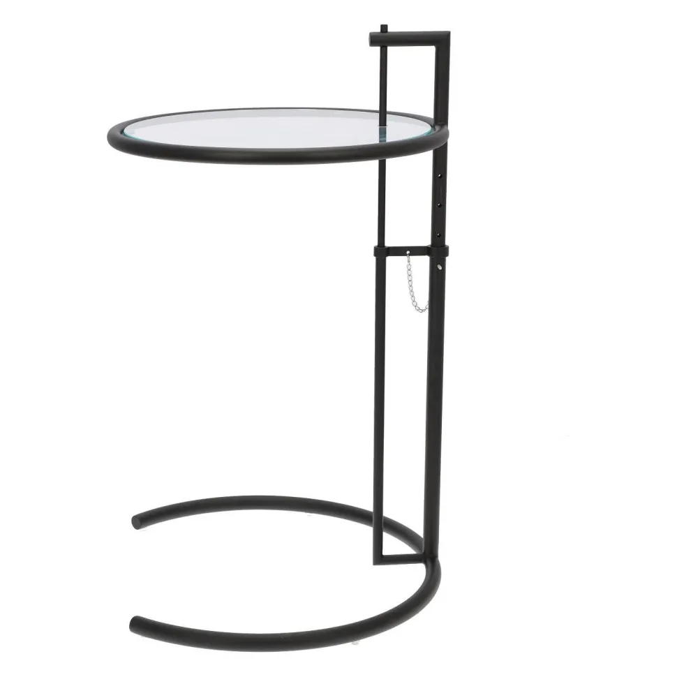 Stolik został zaprojektowany w 1927 roku. Początkowo stał w pokoju, w mieszkaniu projektantki.,Stolik można regulować na wysokość. Blat stolika może znajdować się od 62 do 100cm od podłogi. Baza stolika jest malowana proszkowo na kolor czarny, a blat wykonany z transparentnego hartowanego szkła.,Prezentowany produkt jest inspirowany projektem E.Gray.