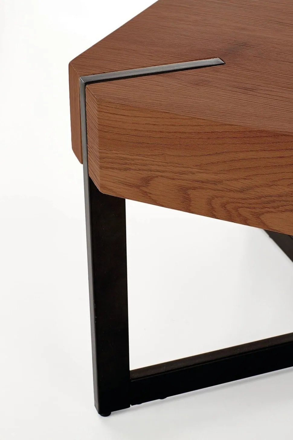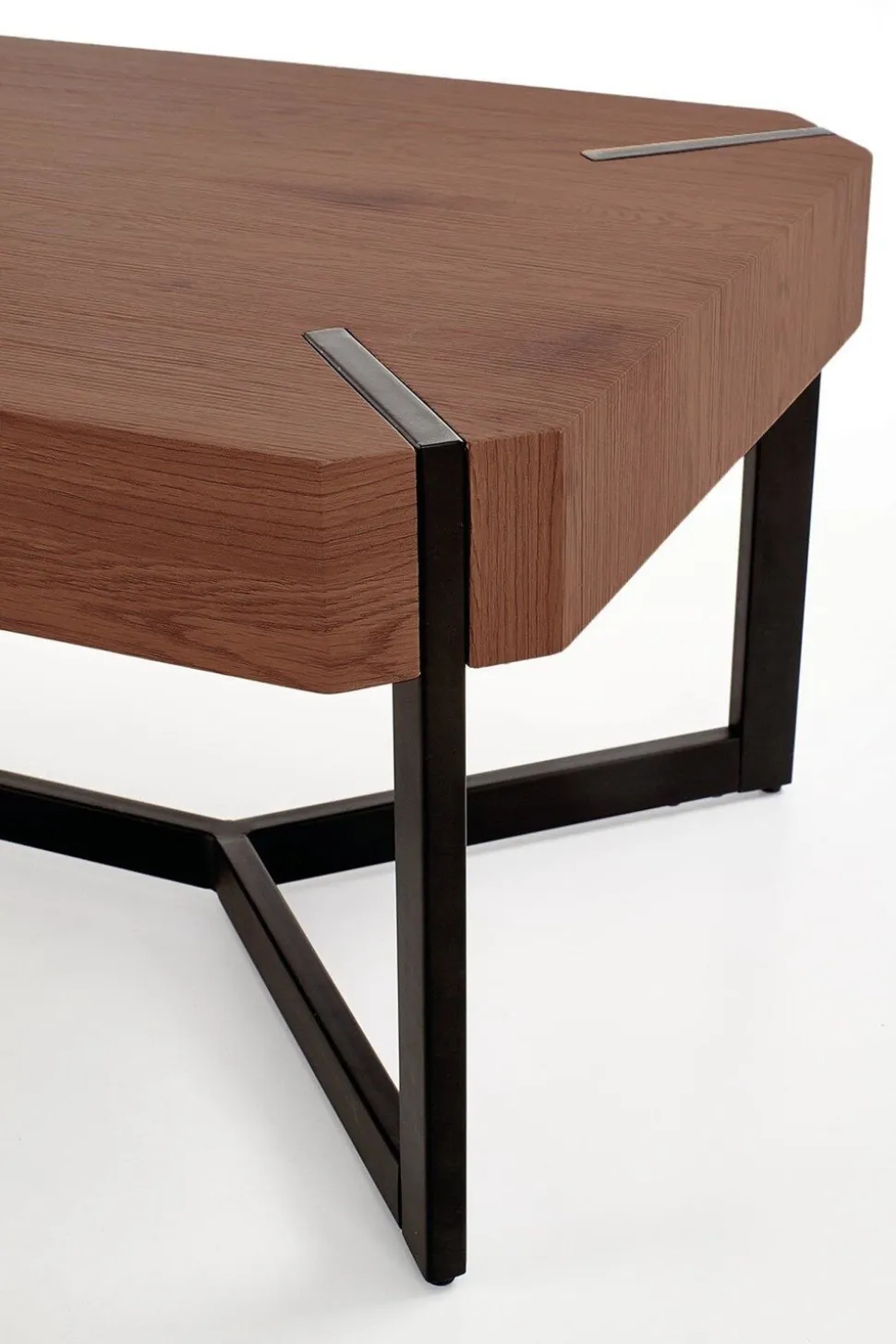 - Połączenie orzechowego blatu i czarnej stali tworzy surowy, industrialny design
