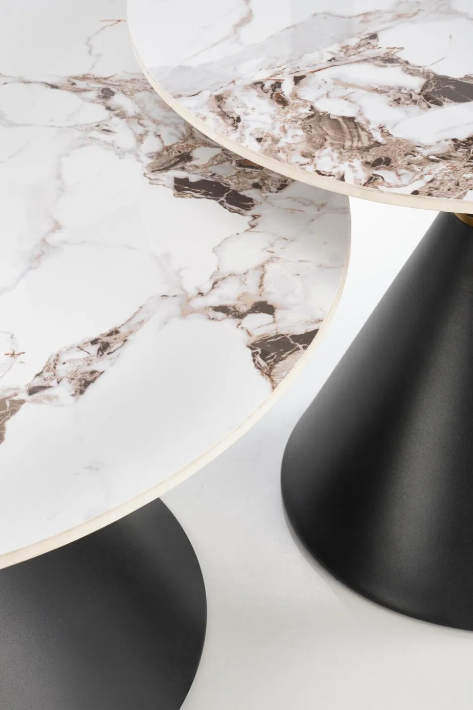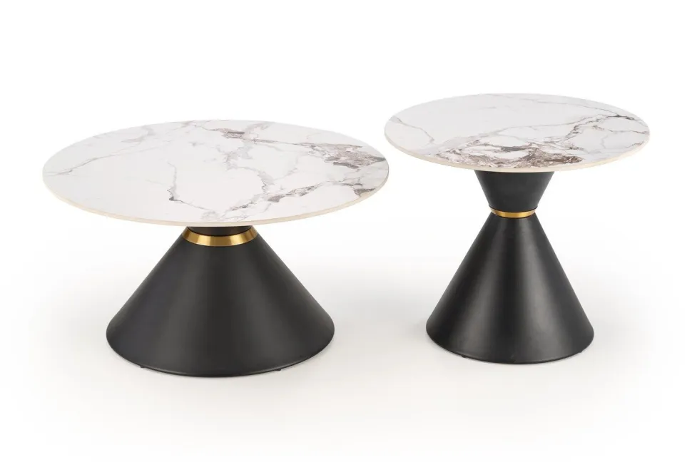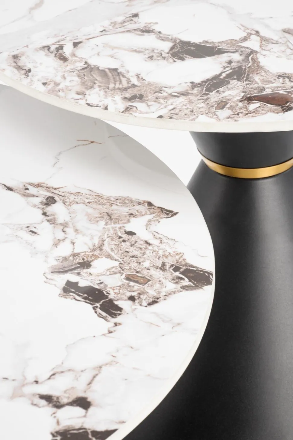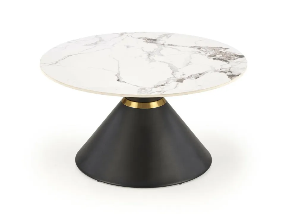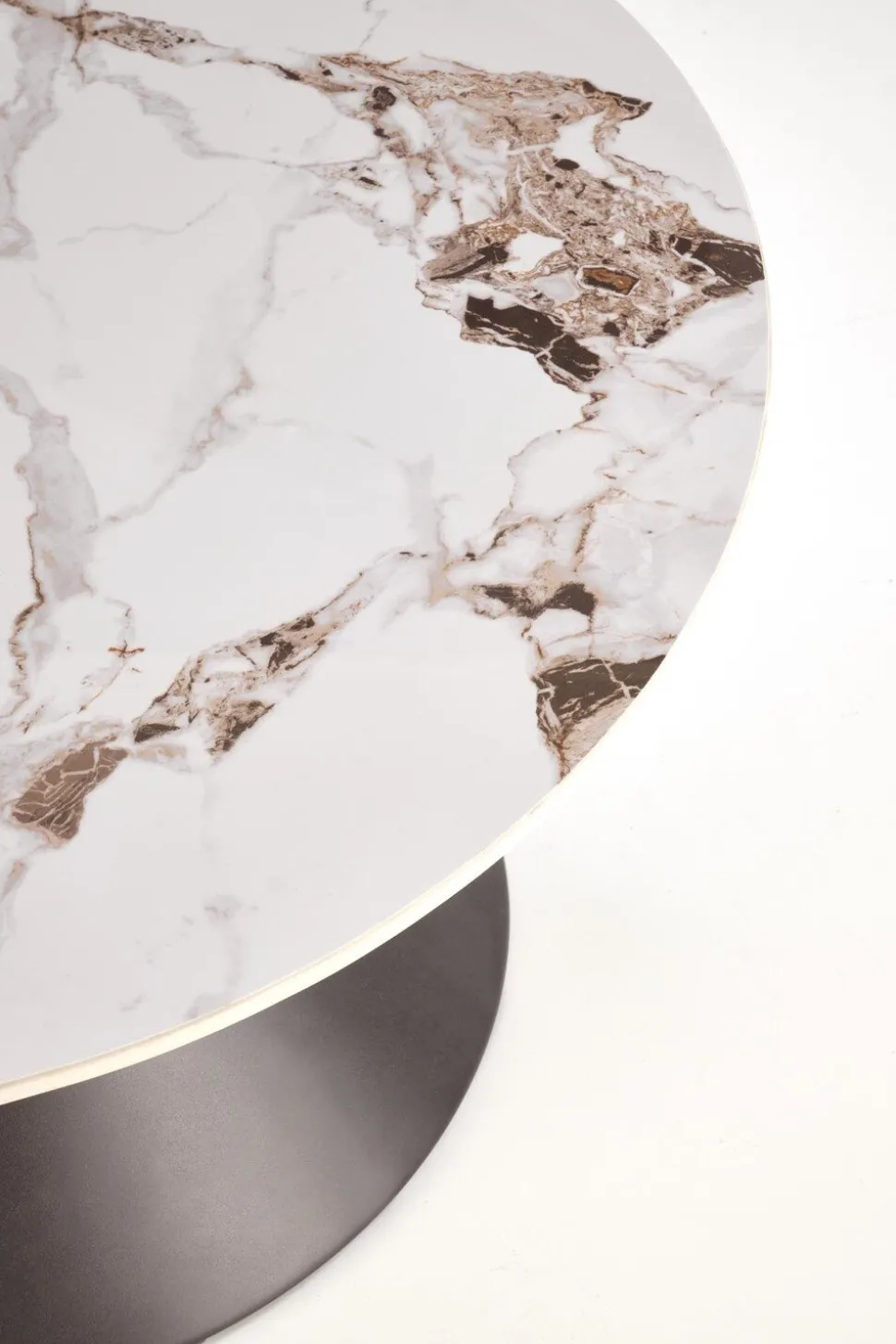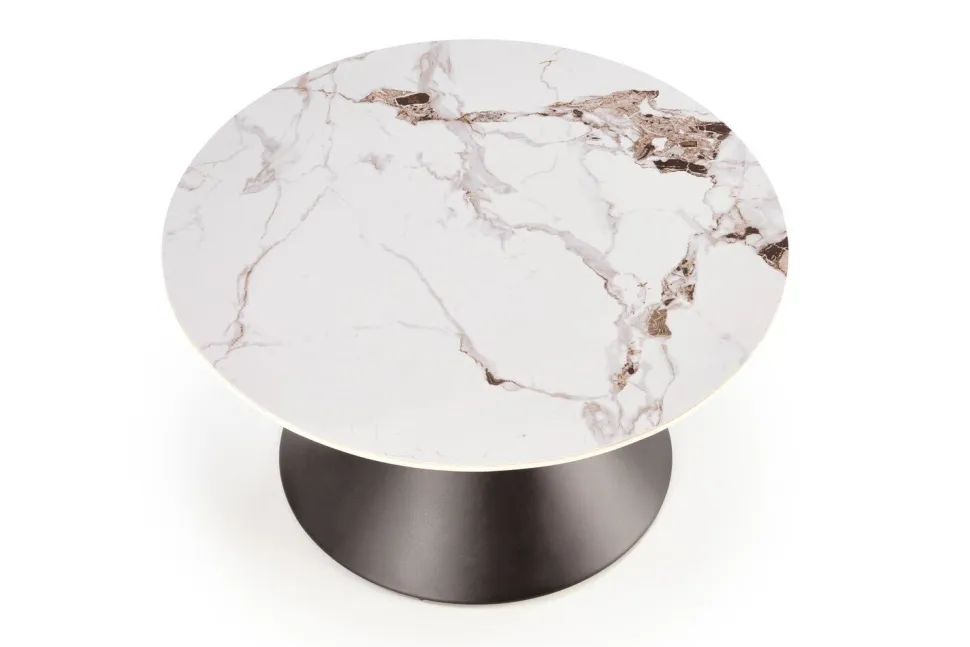 Stolik kawowy Javin M to stylowy mebel, który łączy elegancję białego marmuru z nowoczesnym, industrialnym wykończeniem. Jego okrągły blat o średnicy 80 cm wykonany jest ze spieku kwarcowego w kolorze białego marmuru, co nadaje stolikowi luksusowy wygląd, a jednocześnie jest bardzo wytrzymały i odporny na codzienne użytkowanie. Podstawa wykonana ze stali malowanej proszkowo na czarno doskonale kontrastuje z marmurowym blatem, tworząc nowoczesny, minimalistyczny design.