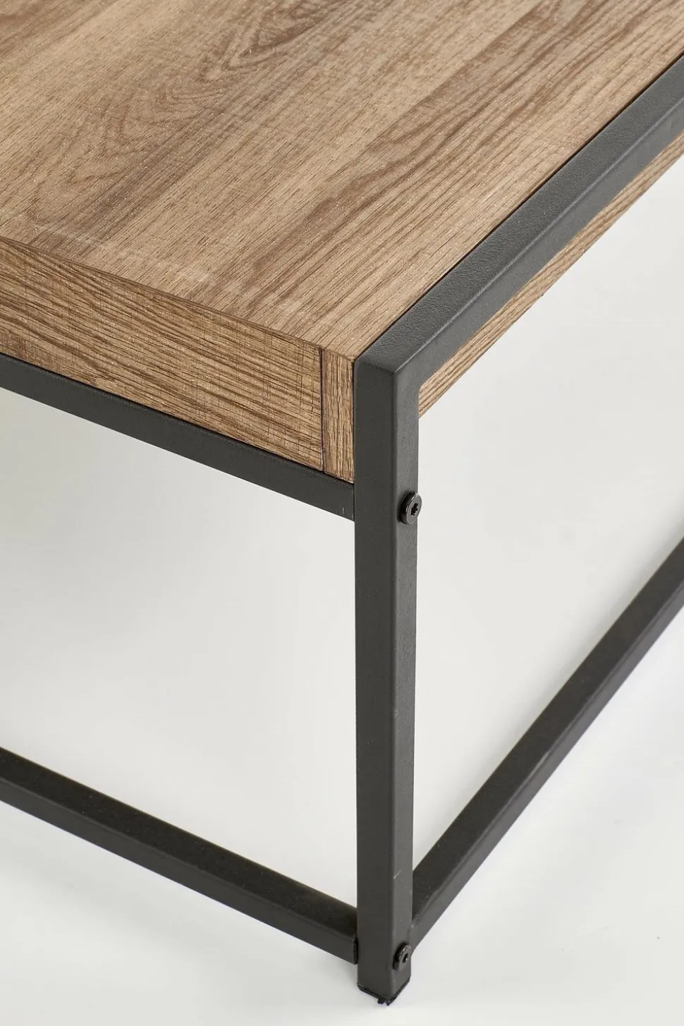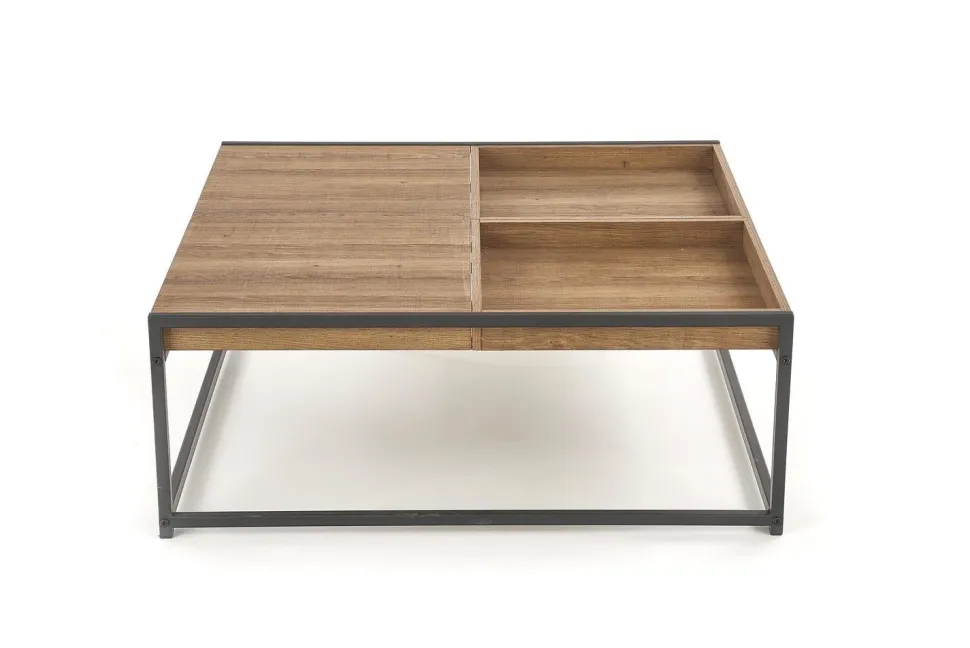 Stelaż metalowy w czarnym kolorze dodaje mu nowoczesnego wyglądu, a pojemnik zwiększa jego funkcjonalność. Blat prostokątny o szerokości 84 cm wykonany z MDF okleinowanego w orzechu miodowym jest nie tylko estetyczny, ale także łatwy w utrzymaniu czystości. Wysokość 30 cm i głębokość 80 cm sprawiają, że stolik jest wygodny w użytkowaniu.