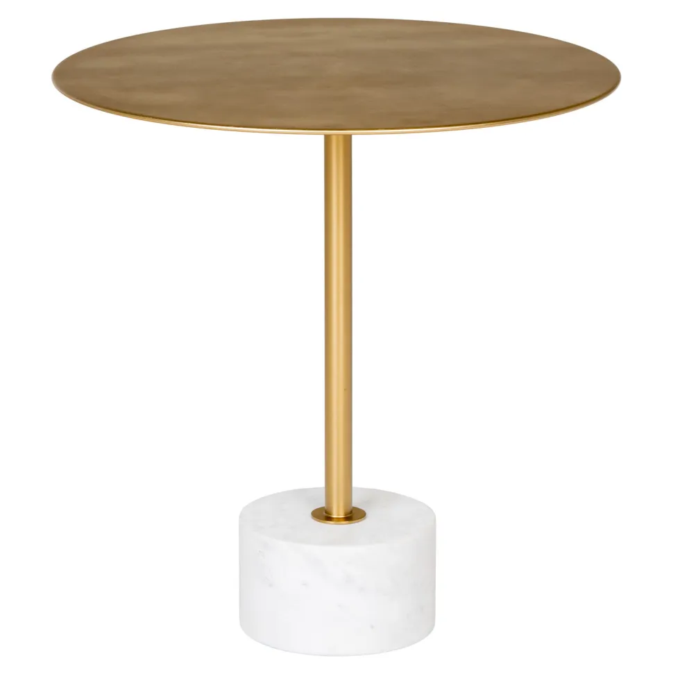 Ten okrągły stolik o średnicy 51cm to połączenie stylu glamour i wyjątkowej klasy. Jego metalowy blat w kolorze złotym emanuje luksusem i przyciąga wzrok. Natomiast noga stolika, wykonana z połączenia złotego metalu i białego marmuru, tworzy harmonijną i designerską kompozycję.