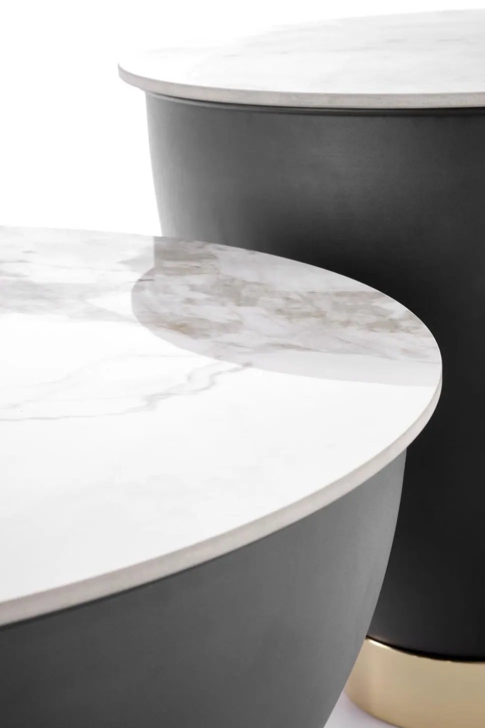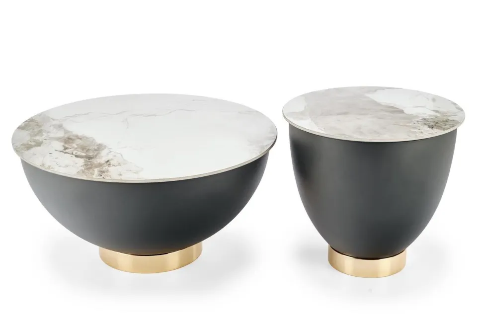 Materiały użyte do produkcji Stolika kawowego Moonshine to ceramika oraz stal malowana proszkowo, które tworzą harmonijną i stylową kompozycję. Kolorystyka biały marmur – popielaty – złoty dodaje meblowi wyrafinowanego wyglądu, idealnego zarówno dla salonu w stylu glamour, jak i nowoczesnego biura.