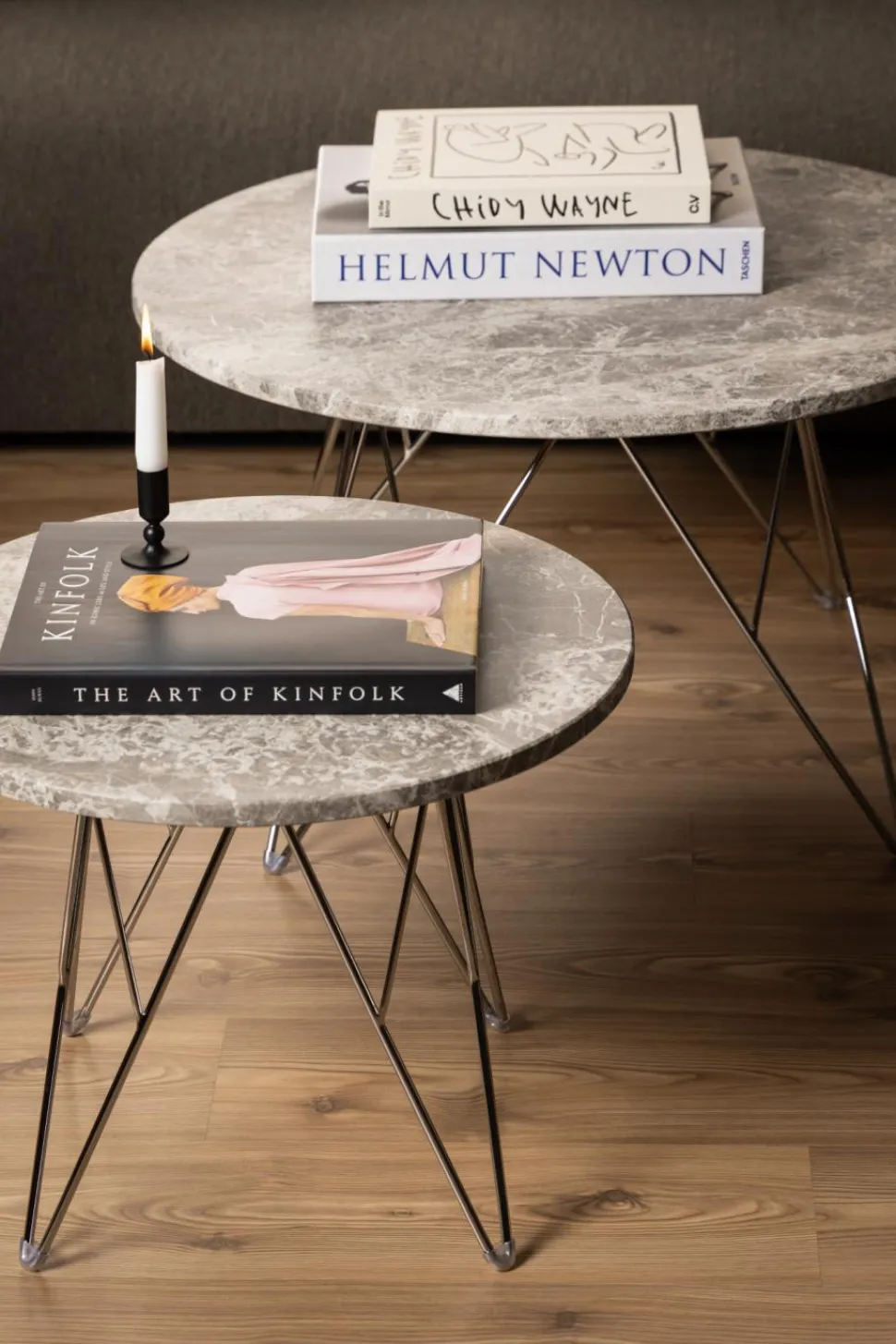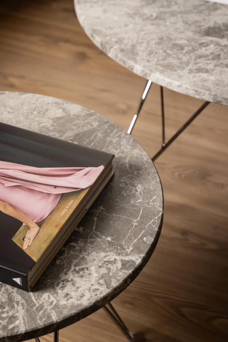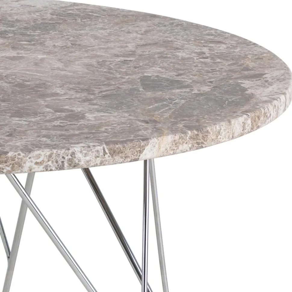 Druciana podstawa ze stali chromowanej dodaje stolikowi lekkości, zachowując jednocześnie jego nowoczesny i elegancki wygląd. Chromowane wykończenie harmonijnie kontrastuje z ciężkim, marmurowym blatem, tworząc zbalansowaną i efektowną całość.