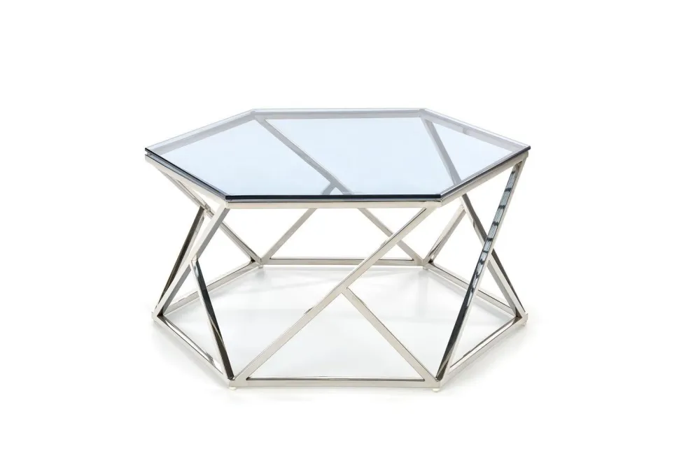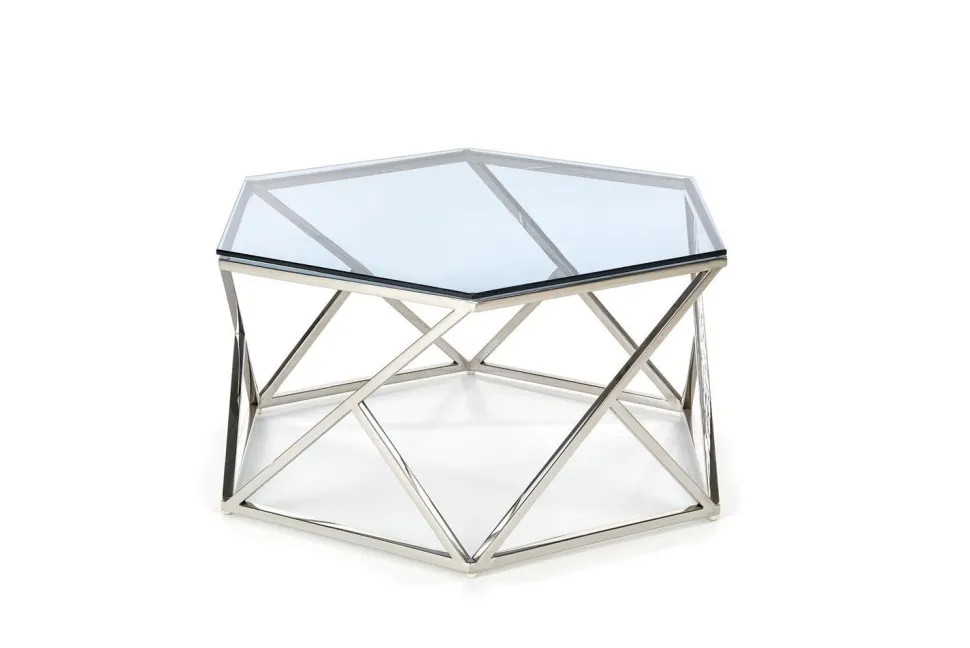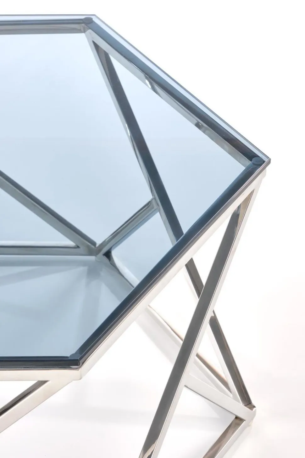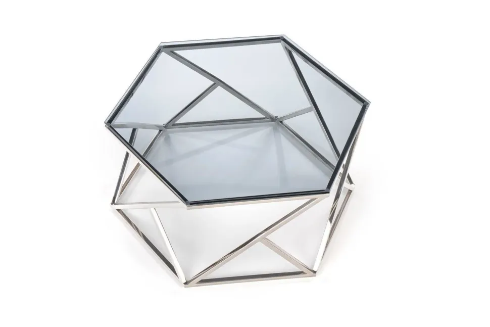 Stolik kawowy Tina to idealne rozwiązanie dla osób ceniących sobie nowoczesny styl oraz glamour. Jego heksagonalny blat wykonany z transparentnego, dymionego szkła dodaje mu wyjątkowego charakteru, a stal nierdzewna w połączeniu z chromowym stelażem gwarantują trwałość i elegancki wygląd.