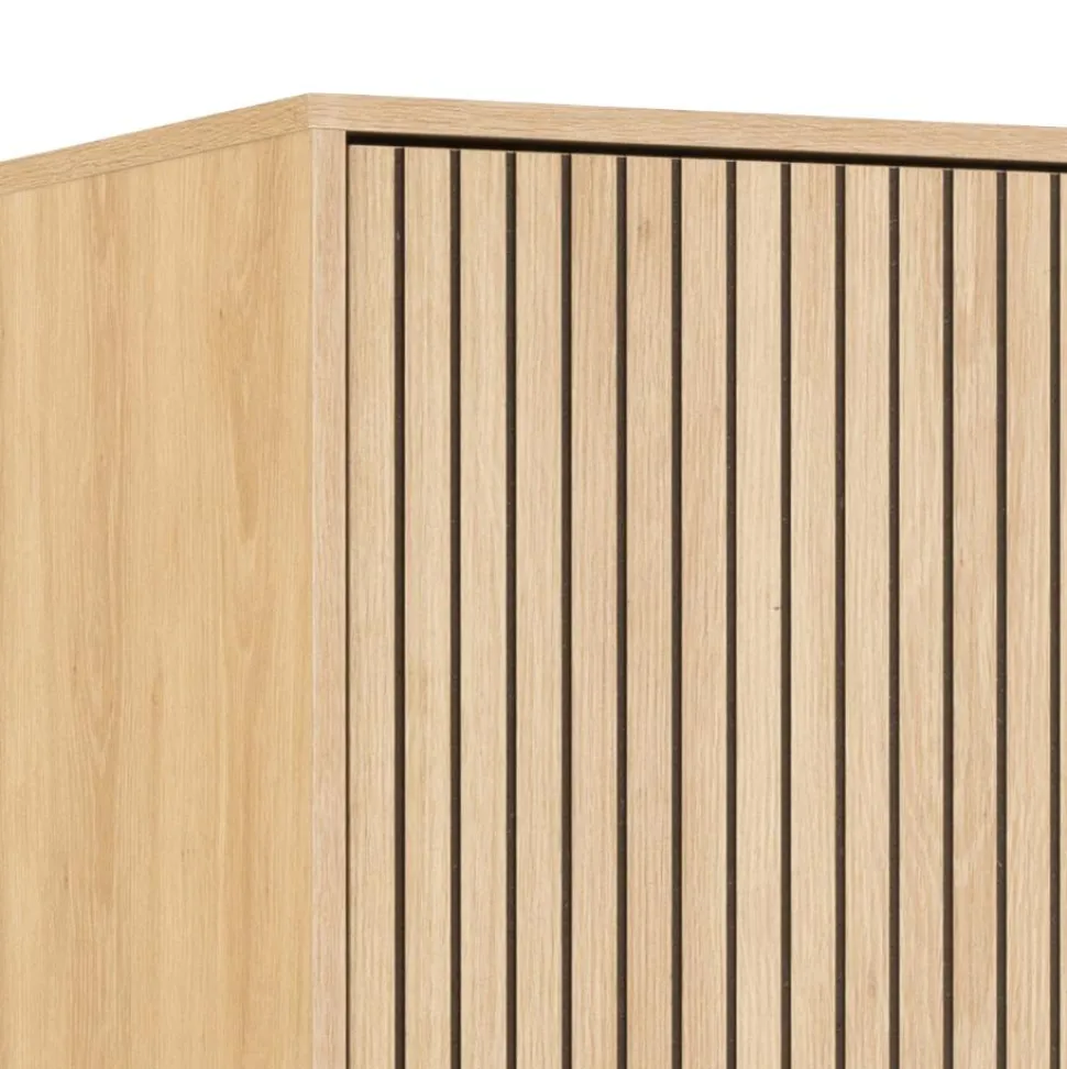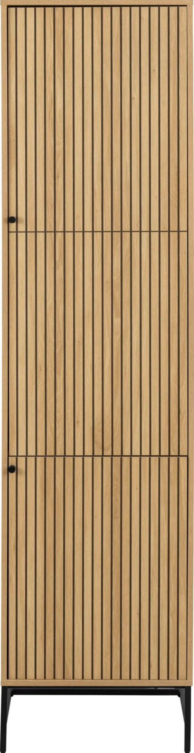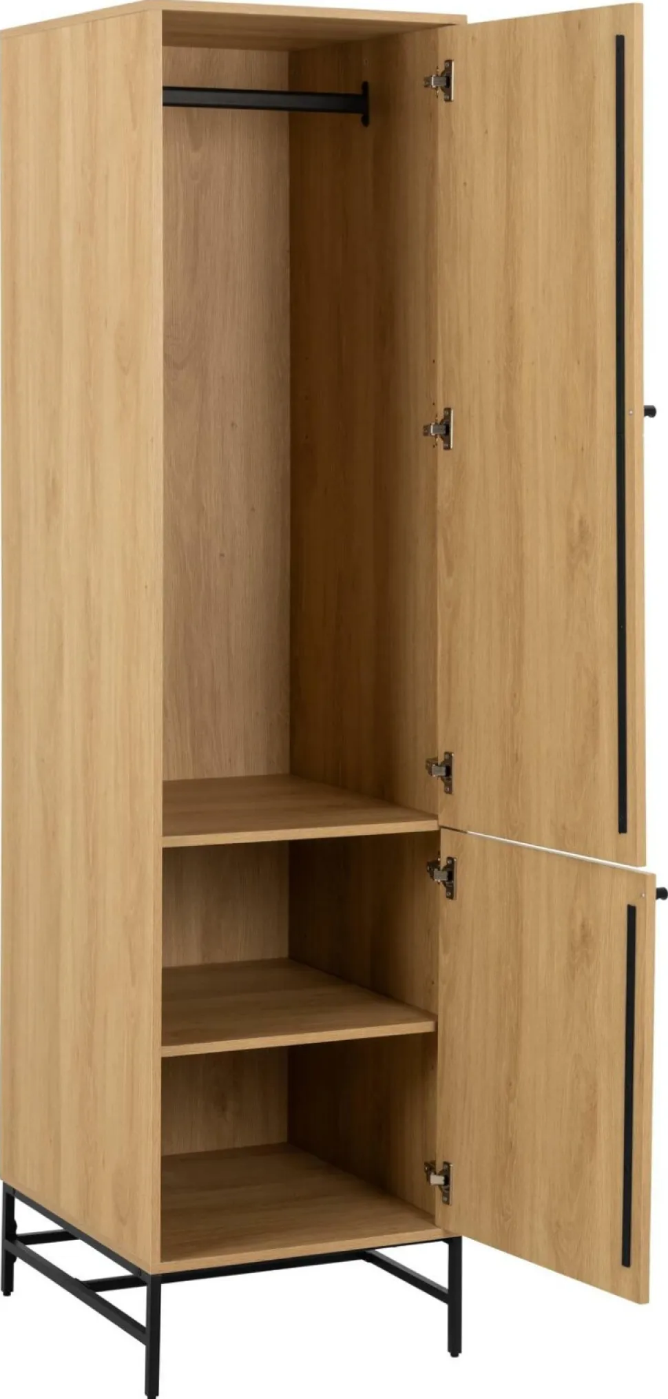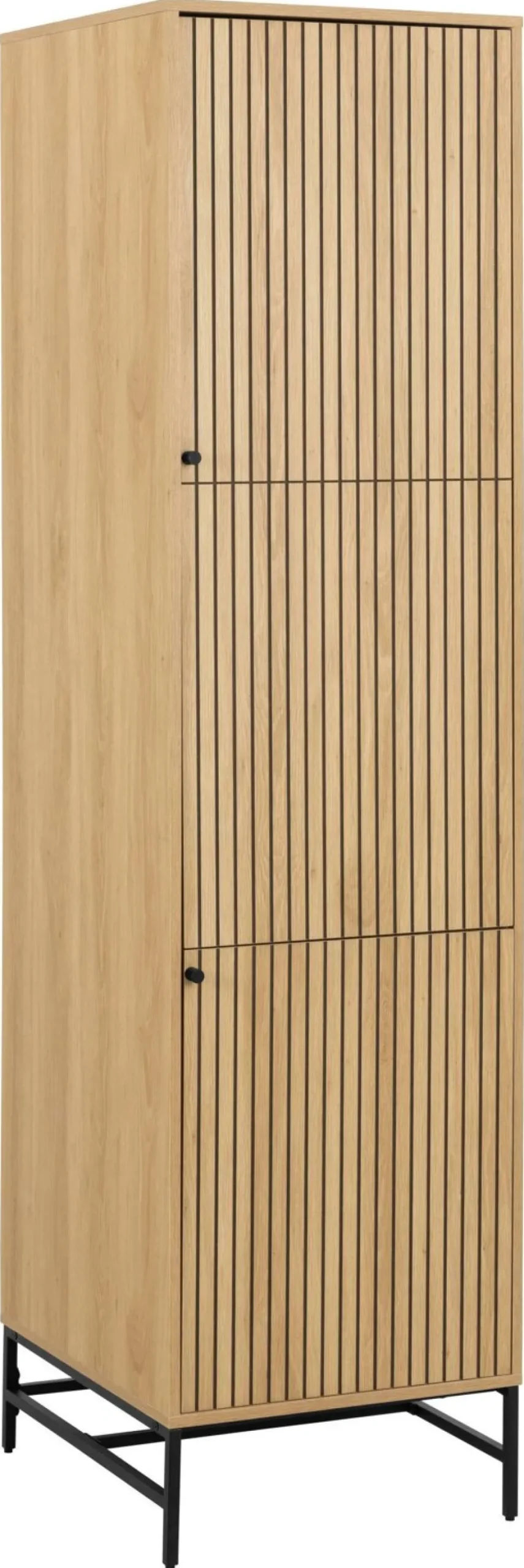 Szukasz praktycznej i stylowej szafy do swojego domu? Szafa Albany wąska dąb naturalny to idealny wybór. Wykonana z wysokiej jakości materiałów, taka jak stal malowana proszkowo i płyta meblowa, jest nie tylko trwała, ale także łatwa do czyszczenia. Fronty lamelowe nadają jej wyjątkowego charakteru i nowoczesnego wyglądu. Szafa Albany posiada 2 regulowane półki i drążek na ubrania, dzięki czemu zapewnia dużo miejsca do przechowywania różnego rodzaju rzeczy.