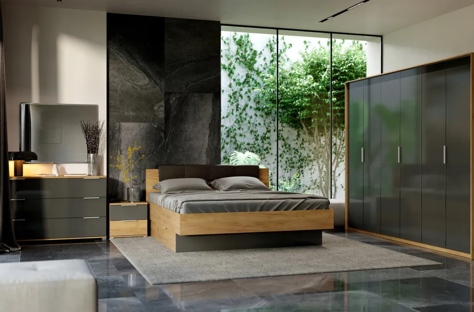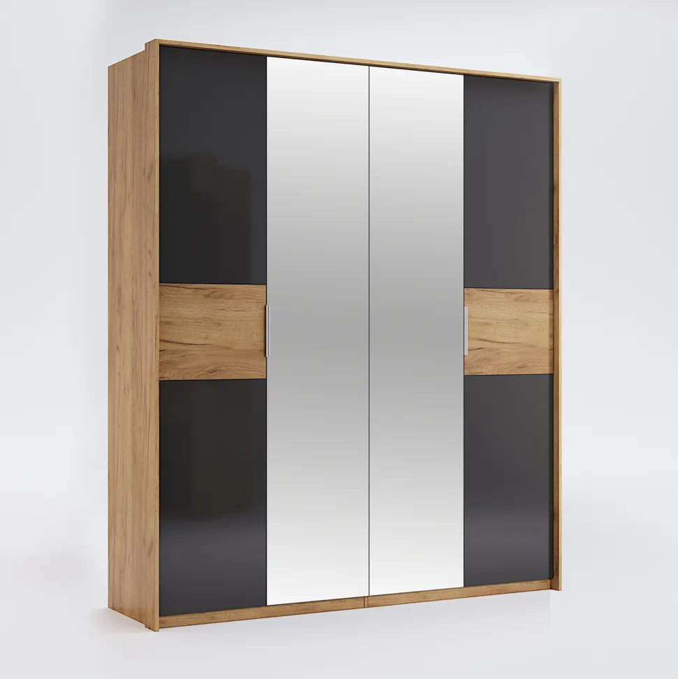 Szafa Matle 4 drzwi z lustrem dąb/szary to niezwykle elegancki i funkcjonalny mebel, który doskonale wpisuje się w nowoczesne wnętrza. Jej minimalistyczny design jest idealnym rozwiązaniem dla osób poszukujących mebli o nowoczesnym stylu, który równocześnie zachowuje subtelną elegancję.