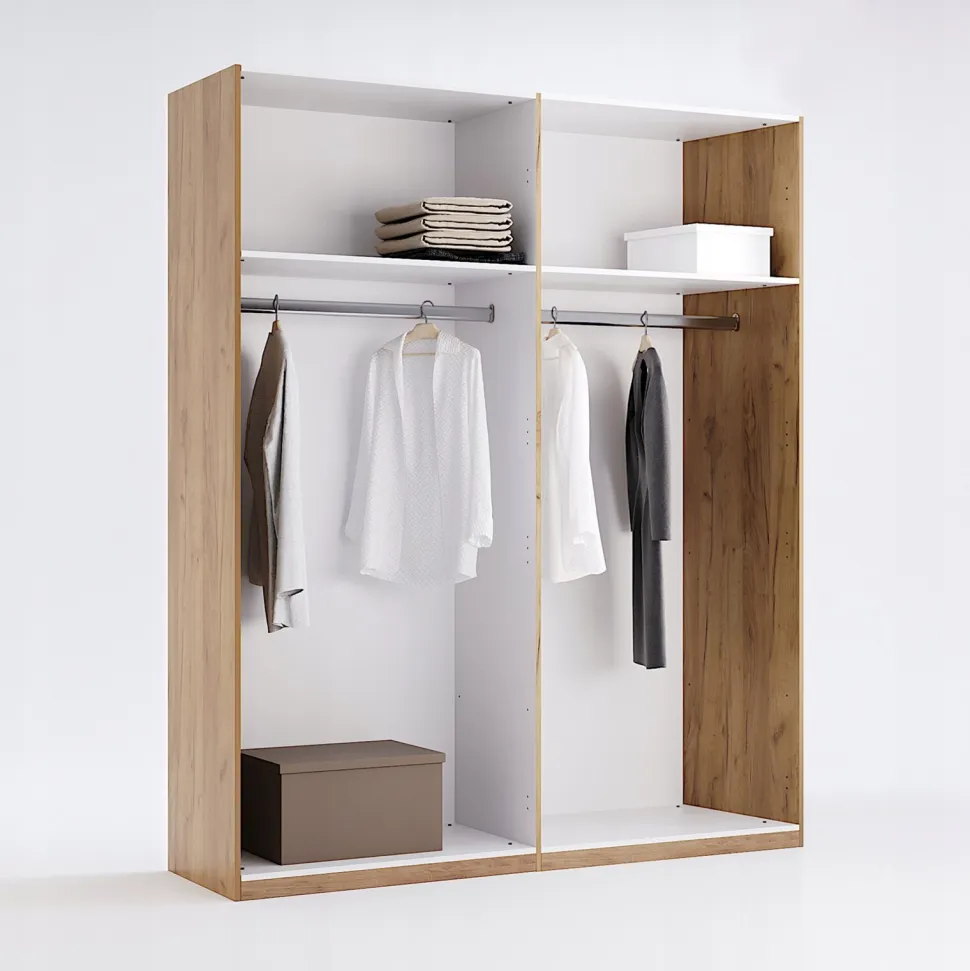 Wnętrze szafy zostało zaprojektowane z myślą o maksymalnej funkcjonalności. Znajdujące się wewnątrz półki i drążek umożliwiają wygodne przechowywanie ubrań, butów oraz innych akcesoriów, dzięki czemu można zachować porządek we wnętrzu sypialni.