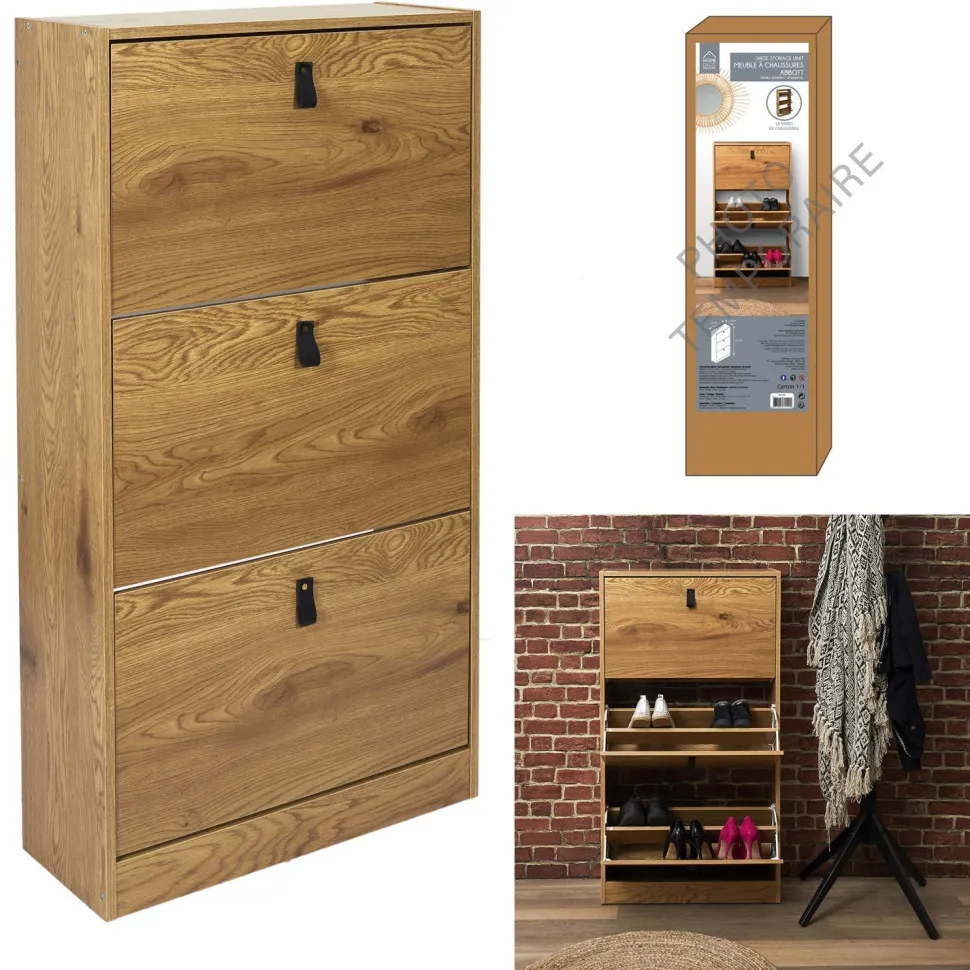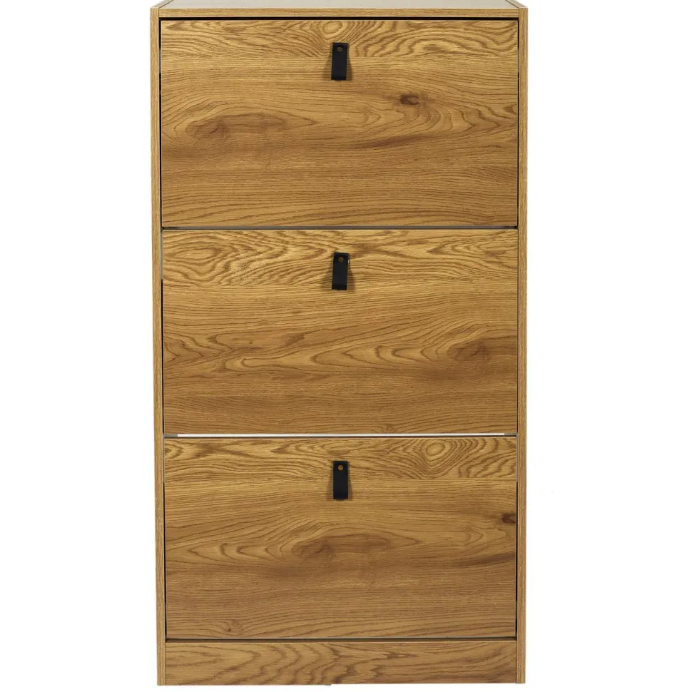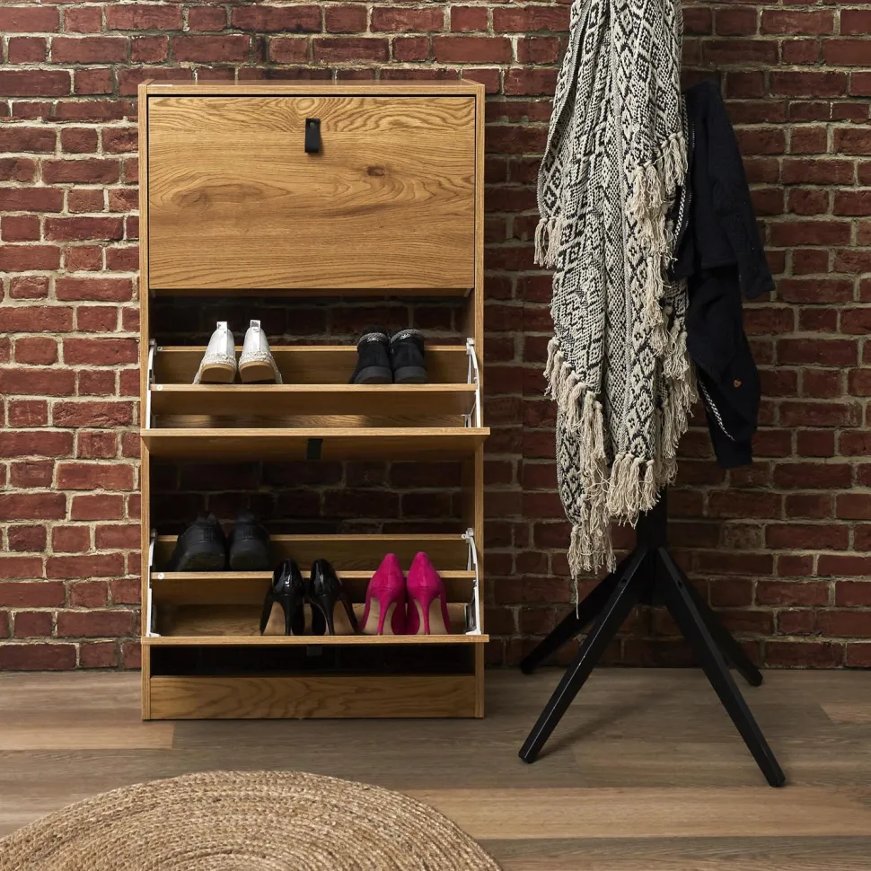 Wąska szafka na buty Abbott składa się z trzech frontów, które po uchyleniu umożliwiają nam schowanie butów w specjalnie przygotowanych na nie przegródkach.Szafkawyróżnia się minimalistyczną i prostą formą, która odnajdzie się w przedpokoju i korytarzu w każdym stylu. Cała konstrukcja oraz gładkie fronty wykonane zostały z laminowanej płyty MDF, która jest odporna na intensywne użytkowanie i posłuży w dobrym stanie przez wiele lat. Powierzchnia płyt pokryta została okleiną drewnianą w kolorze dębu. Szafka na buty Abbott to idealny mebel do jasnej kawalerki lub wnętrza w stylu skandynawskim. Szafka wymaga samodzielnego montażu.
