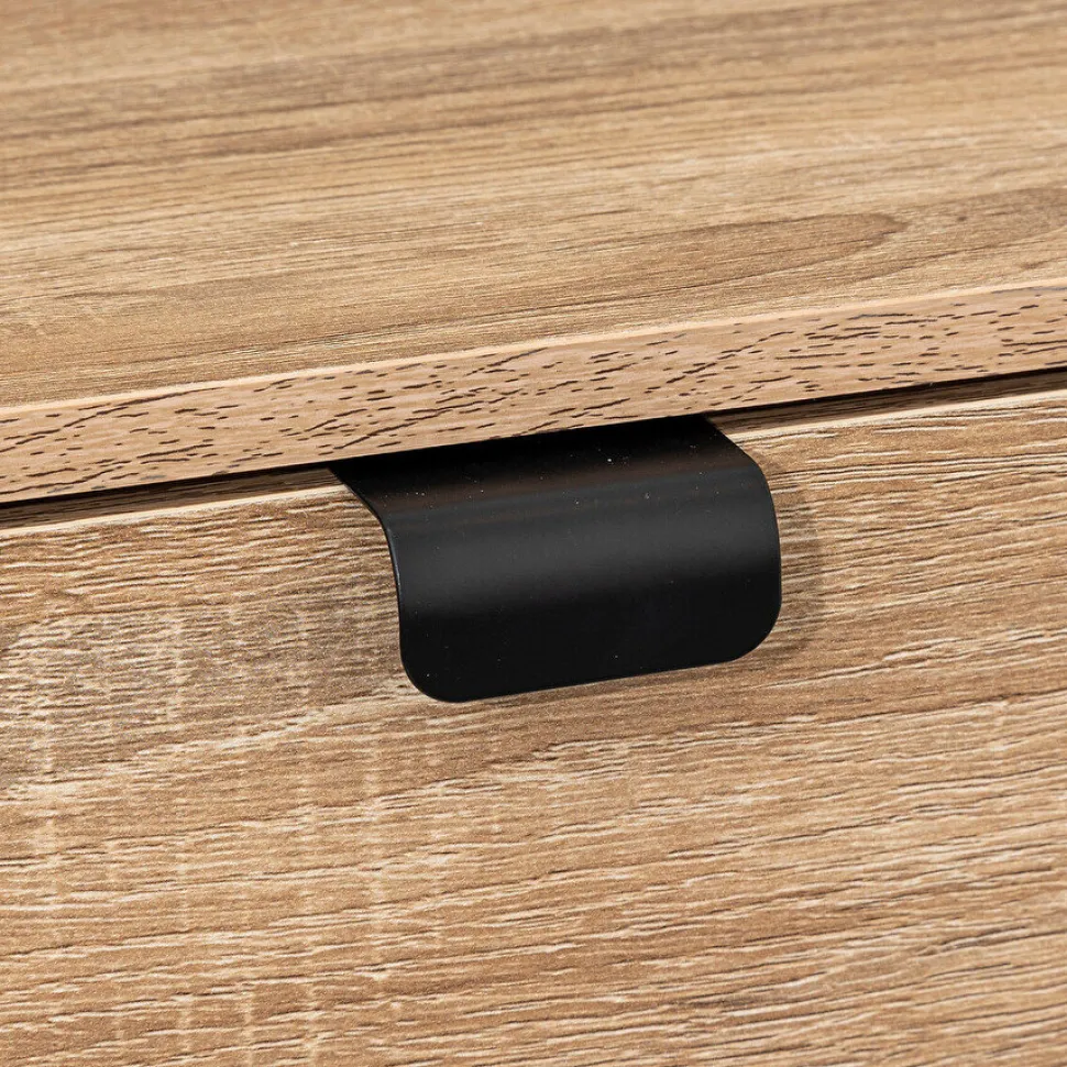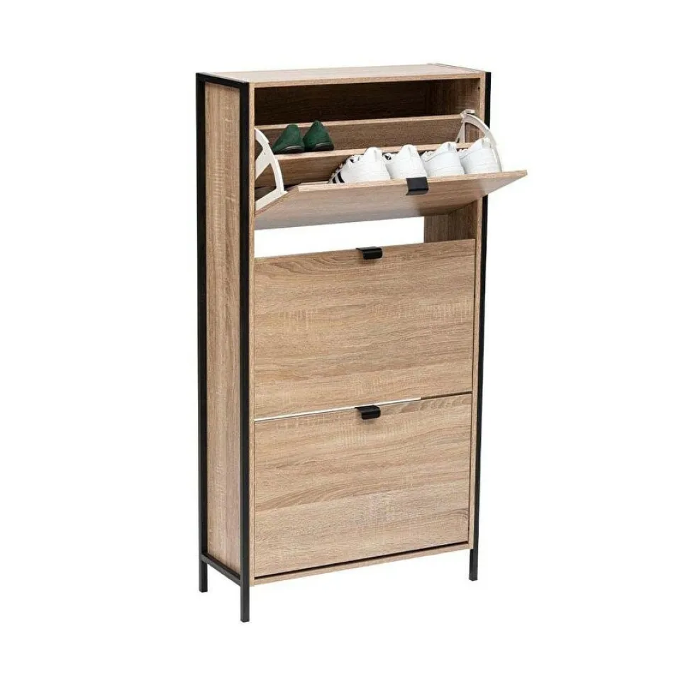 Loftowy dodatek do wnętrza: szafka na buty Aliaj Szafka na buty Aliaj w naturalno-czarnym wydaniu to mebel, który doskonale łączy funkcjonalność z minimalistycznym designem. Ta uniwersalna szafka o prostym wzornictwie doskonale wpisuje się w loftowe i nowoczesne wnętrza, ułatwiając utrzymanie porządku w Twoim domu. Szafka wykonana jest z trwałej płyty wiórowej z aglomeratem, co gwarantuje jej wytrzymałość i trwałość.