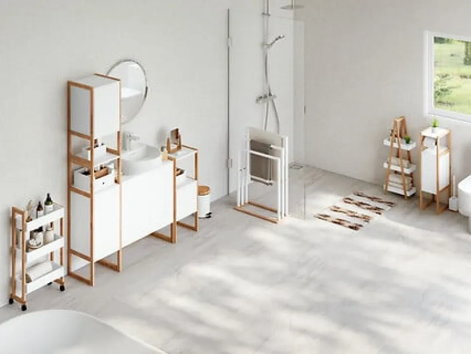 Szafka Natureo posiada podstawę w postaci płoz, wykonanych z drewna bambusowego. Taka konstrukcja zapewnia stabilność mebla i zabezpiecza go przed bezpośrednim kontaktem z podłogą, co jest szczególnie ważne w wilgotnym środowisku łazienki. Drewno bambusowe to materiał nie tylko trwały, ale i estetyczny, dodający szafce naturalnego, ciepłego wyglądu.