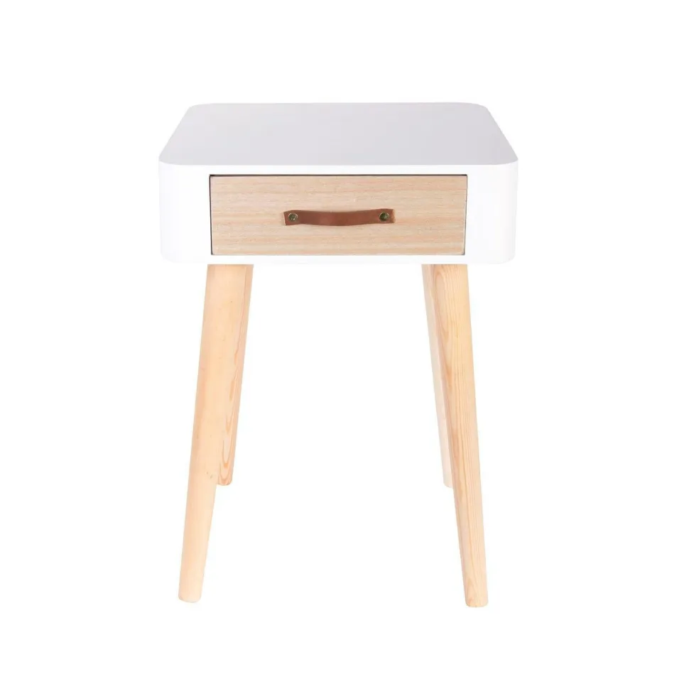 Szafka nocna Enano to harmonijne połączenie funkcjonalności i estetyki, które doskonale wpisuje się w styl skandynawski. Jej minimalistyczna forma, biel korpusu i blatu w zestawieniu z naturalnym drewnem frontu szuflady oraz nóg, tworzą przytulną i ciepłą kompozycję. Zaokrąglone krawędzie i skośne nóżki nadają meblowi lekkości, sprawiając, że idealnie pasuje zarówno do nowoczesnych, jak i klasycznych aranżacji sypialni.