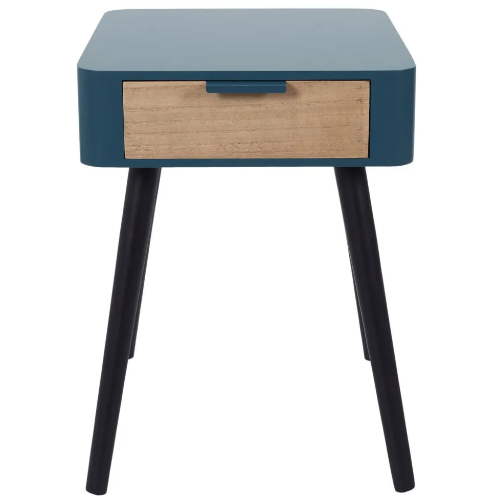 Styl skandynawski pozwala wprowadzić do wnętrza niezwykle przytulna atmosferę. Nic dziwnego, że ten styl tak często zostaje wybierany do urządzenia domowej sypialni. Sypialnia to miejsce, które powinno w stu procentach ułatwić nam relaks po długim dniu. Drewniana szafka nocna Padano to mebel, który pozwoli na uzyskanie urokliwego klimatu. Konstrukcja wykonana z połączenia trwałych materiałów. Cztery nogi w naturalnym jasnym kolorze to lite drewno sosnowe. Natomiast korpus to mocna płyta MDF pomalowana na niebiesko. Szafka posiada pojemną szufladę, której front pokryty został laminatem imitującym drewno. To świetne miejsce do przechowywania lektury na wieczór lub innych podręcznych rzeczy.