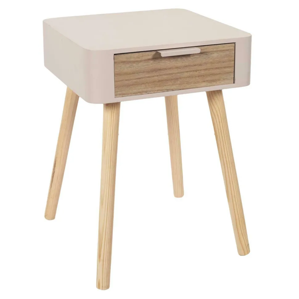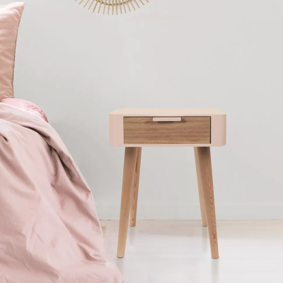 Styl skandynawski pozwala wprowadzić do wnętrza niezwykle przytulna atmosferę. Nic dziwnego, że ten styl tak często zostaje wybierany do urządzenia domowej sypialni. Sypialnia to miejsce, które powinno w stu procentach ułatwić nam relaks po długim dniu. Drewniana szafka nocna Padano to mebel, który pozwoli na uzyskanie urokliwego klimatu. Konstrukcja wykonana z połączenia trwałych materiałów. Cztery nogi w naturalnym jasnym kolorze to lite drewno sosnowe. Natomiast korpus to mocna płyta MDF pomalowana na różowo. Szafka posiada pojemną szufladę, której front pokryty został laminatem imitującym drewno. To świetne miejsce do przechowywania lektury na wieczór lub innych podręcznych rzeczy.