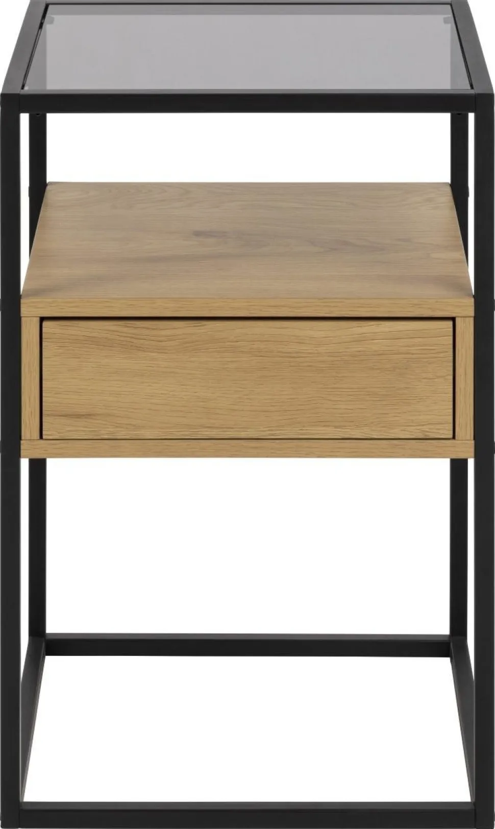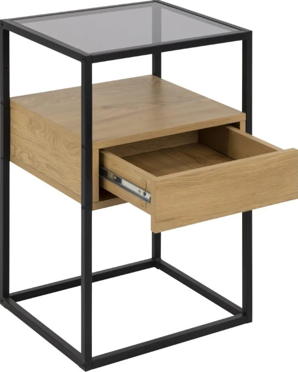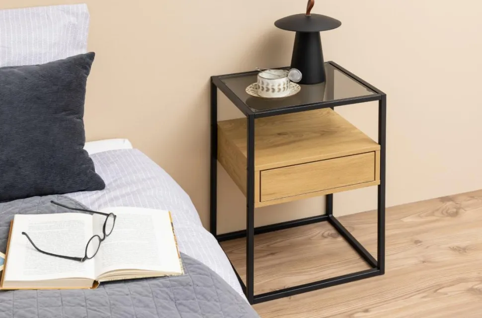 Szafka nocna Randolfto stylowe połączenie elementów szklanych, metalowych i drewnianych. Jej szkielet wykonany jest z malowanego proszkowo metalu w kolorze czarnym. Kwadratowy blat to dymione szkło hartowane, zaś znajdująca się pod nim szuflada to w całości płyta MDF w okleinie w kolorze dębu. Szuflada otwiera się poprzez kliknięcie, pozbawiona jest uchwytów, co jest jej dużym atutem. Dzięki temu cała konstrukcja wygląda schludnie, estetycznie i elegancko. Zamykana szuflada stanowi świetnie miejsce na ukrycie prywatnych rzeczy, zaś blat idealnie sprawdzi się jako miejsce na ulubioną książkę lub lampkę nocną.