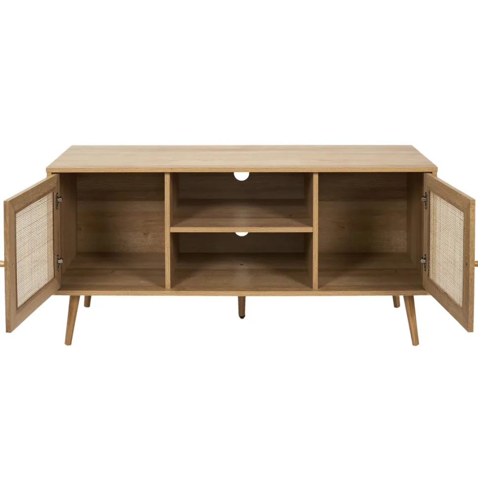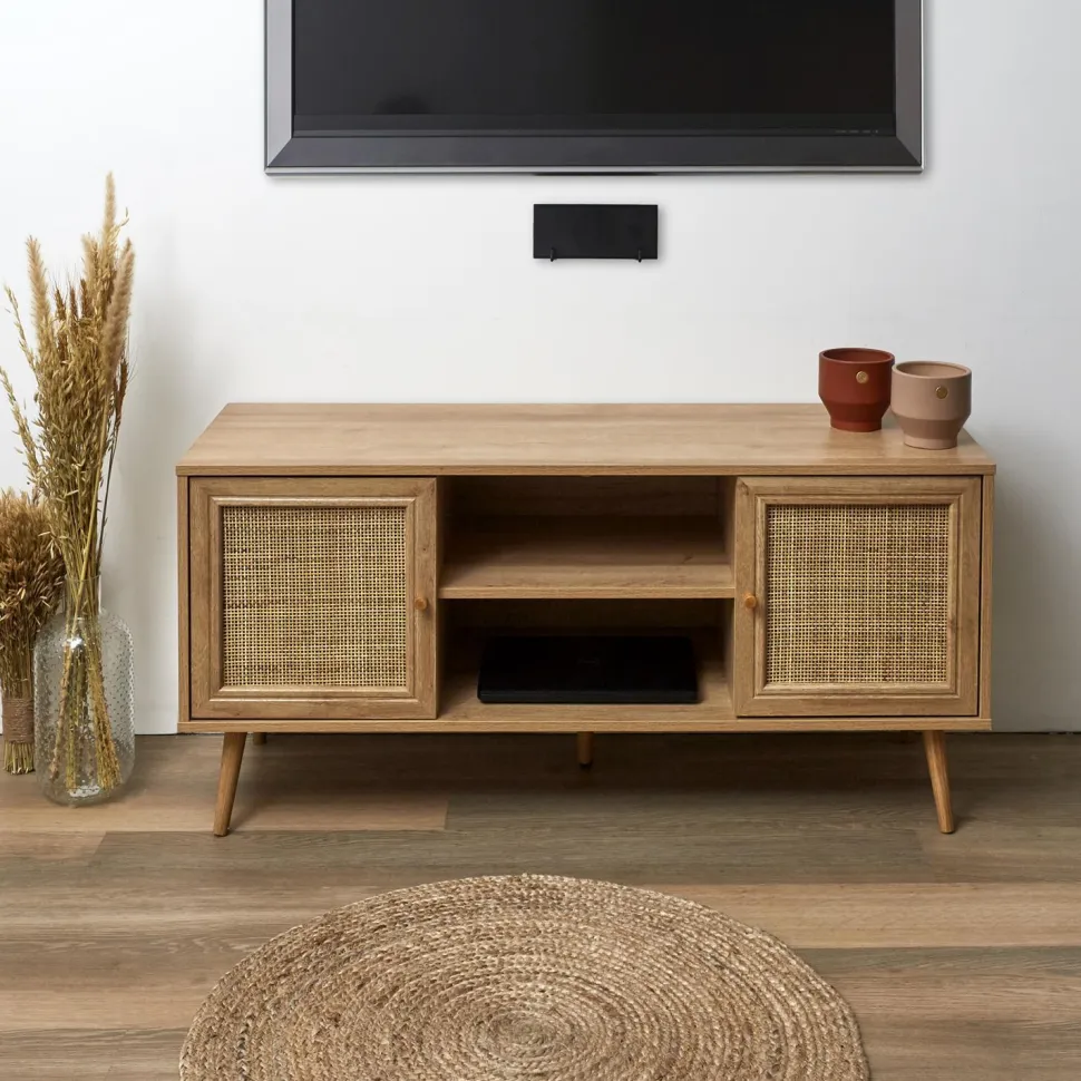 Szafka RTV Bali to kolejny element wyjątkowej kolekcji inspirowanej klimatem balijskich plaż. Jest to mebel, łączący najwyższą jakość z eleganckim designem w naturalnym stylu. Szafka RTV do salonu powinna być przede wszystkim praktyczna i taka właśnie jest szafka Bali, którą wykonano z płyty MDF. Oryginalnym elementem są plecione fronty szafek, nawiązujące do stylistyki boho. Pojemna szafka kryje w sobie bardzo dużą ilość miejsca do przechowywania, w której schowasz wszystkie najpotrzebniejsze rzeczy. Podstawą szafki są cztery nogi, które dzięki swojej budowie gwarantują stabilizację. Jeśli zdecydujesz się na zakup innych mebli z serii Bali, staną się one integralnym zestawem, który ozdobi Twój salon, wprowadzając do niego powiew egzotycznej bryzy. Szafka wymaga samodzielnego montażu, który jest bardzo intuicyjny i prosty.