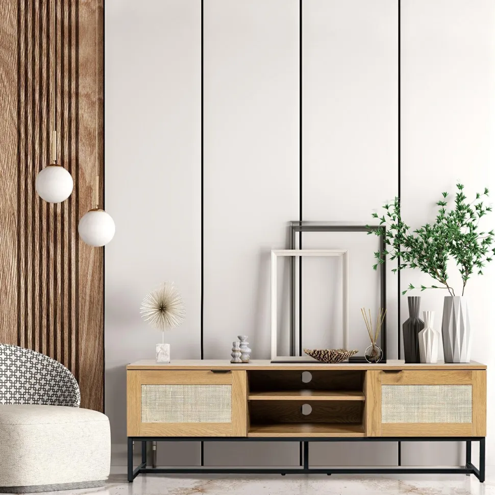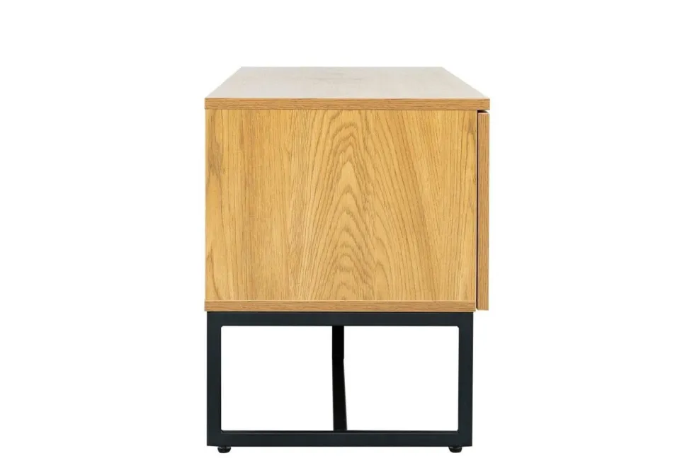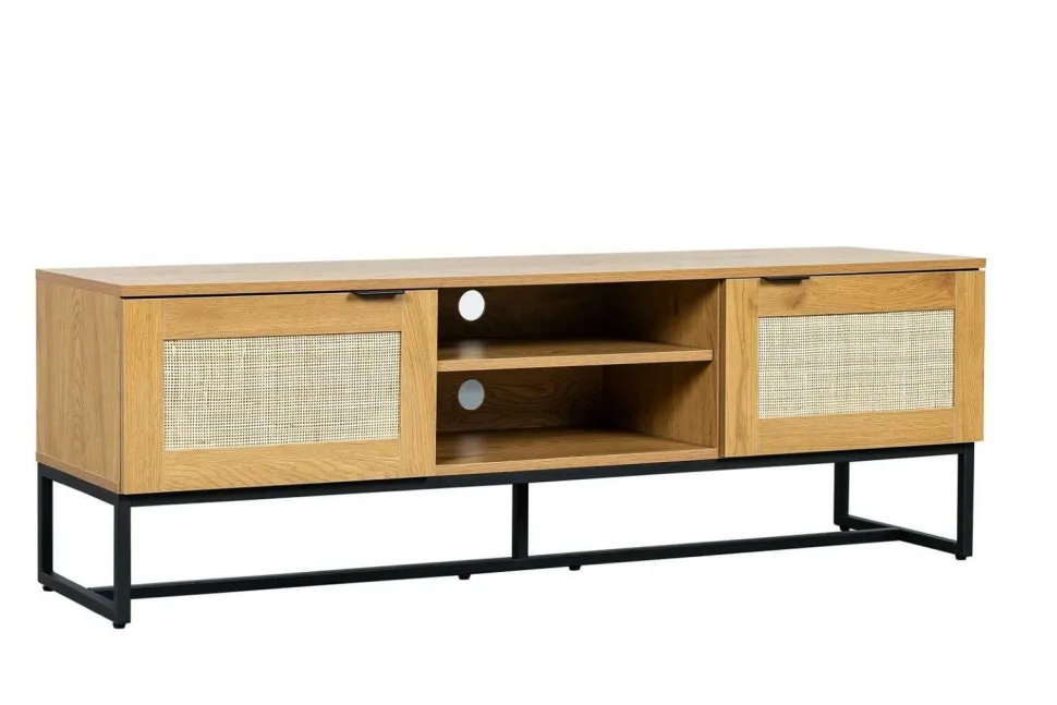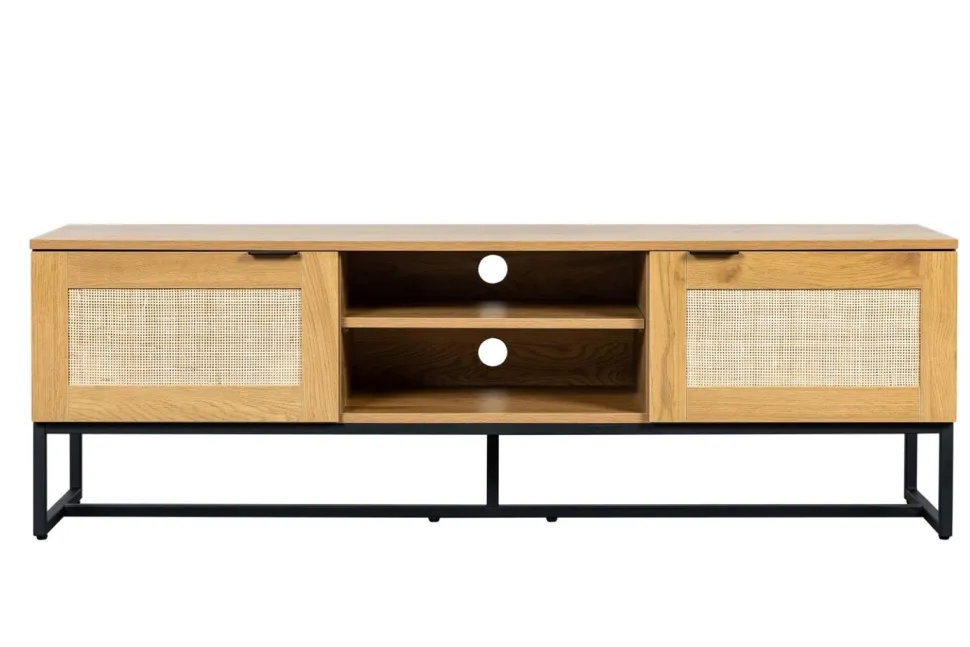 Rattanowa szafka RTV w stylu boho jest idealna do sypialni lub salonu. Posiada dwa fronty skrywające półki, na których możesz przechowywać płyty z filmami lub ukryć dekoder telewizyjny czy router internetowy. Metalowa podstawa zapewnia stabilność i została pomalowana proszkowo na czarno. Wykończeniewzorem dębowym jest niezwykle realistyczne i trwałe.