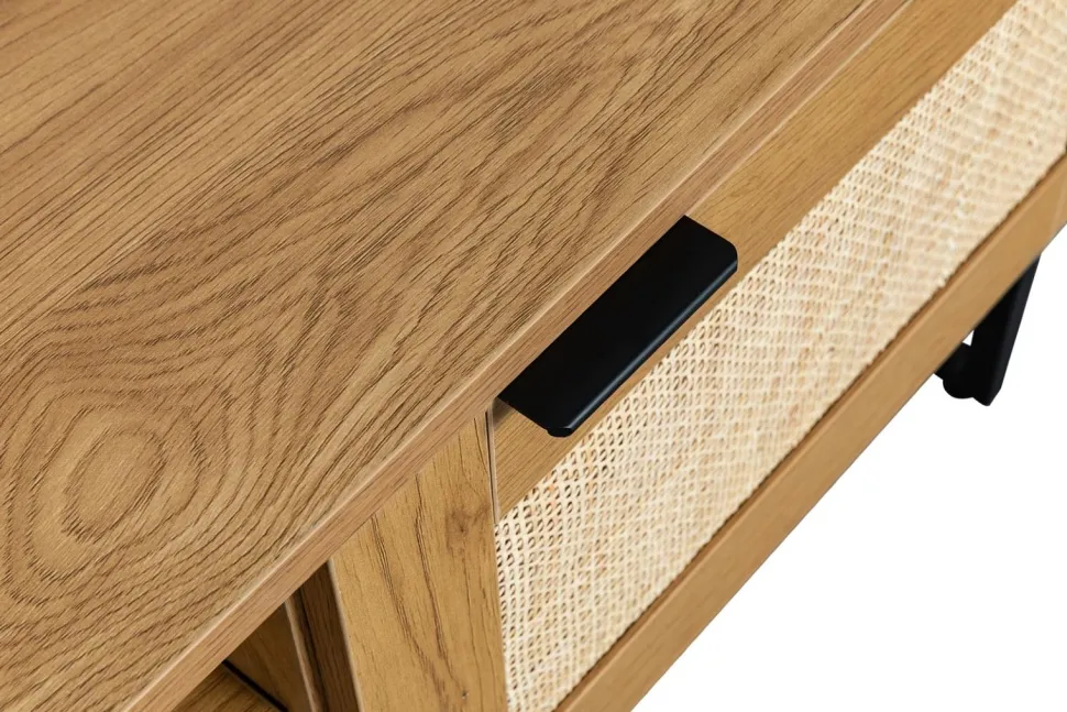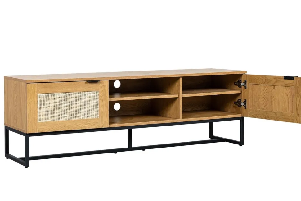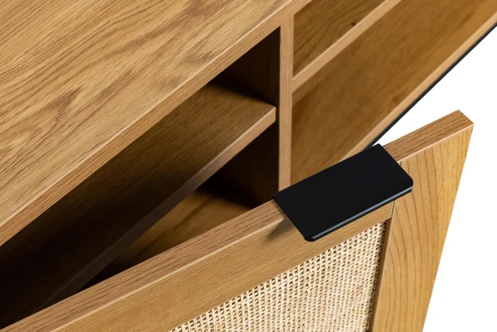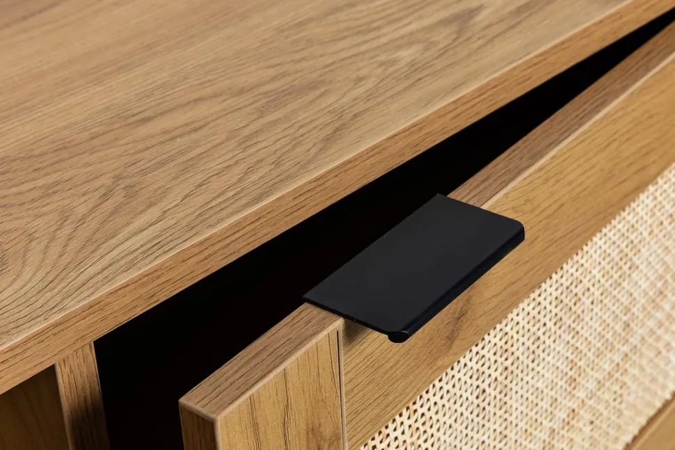 Ale to nie wszystko, jeśli chodzi o wygląd. Ta szafka do przechowywania jest również niezwykle praktyczna. Dwie szafki z rattanowymi frontami zapewnia wystarczająco dużo miejsca, aby ukryć nieestetyczne urządzenia elektryczne, takie jak routery, dekodery i filmy. Wewnętrzne półki są idealne, aby utrzymać wszystko w porządku i poza zasięgiem wzroku.
