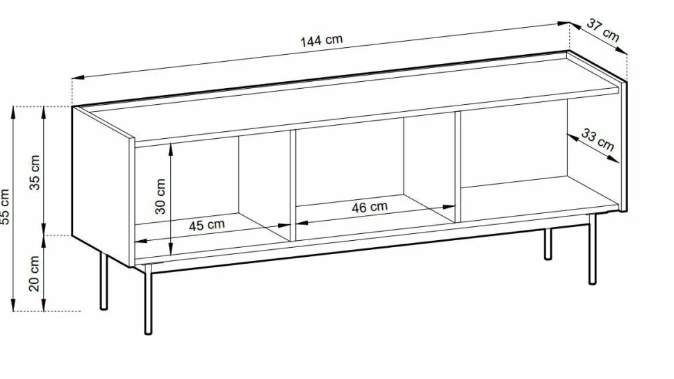 Mebel został stworzony z myślą o prostocie formy i używania.Przechowywanie w trzech frontach, zapewnia dużo miejsca na różne urządzenia czy płyty.Korpus i fronty wykonane są z płyty, a dodatkowe obrzeże ABS nadaje im trwałośći elegancję.Szafka RTV Cashmerposiada metalowe nogi o wysokości 20cm, która dodaje mu lekkości i subtelności.System otwierania poprzez wysuniętą krawędź oraz zawias puszkowy FI 35 na prowadniku clip on, dzięki czemu korzystanie jest niezwykle wygodne i wygodne.Maksymalne obciążenie blatu wynosi 30 kg. Szafka RTVjest elementem kolekcji mebli Cashmer, dzięki czemu możesz stworzyć spójne wnętrze.