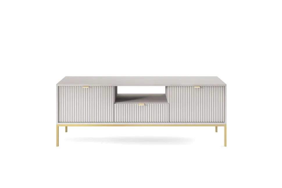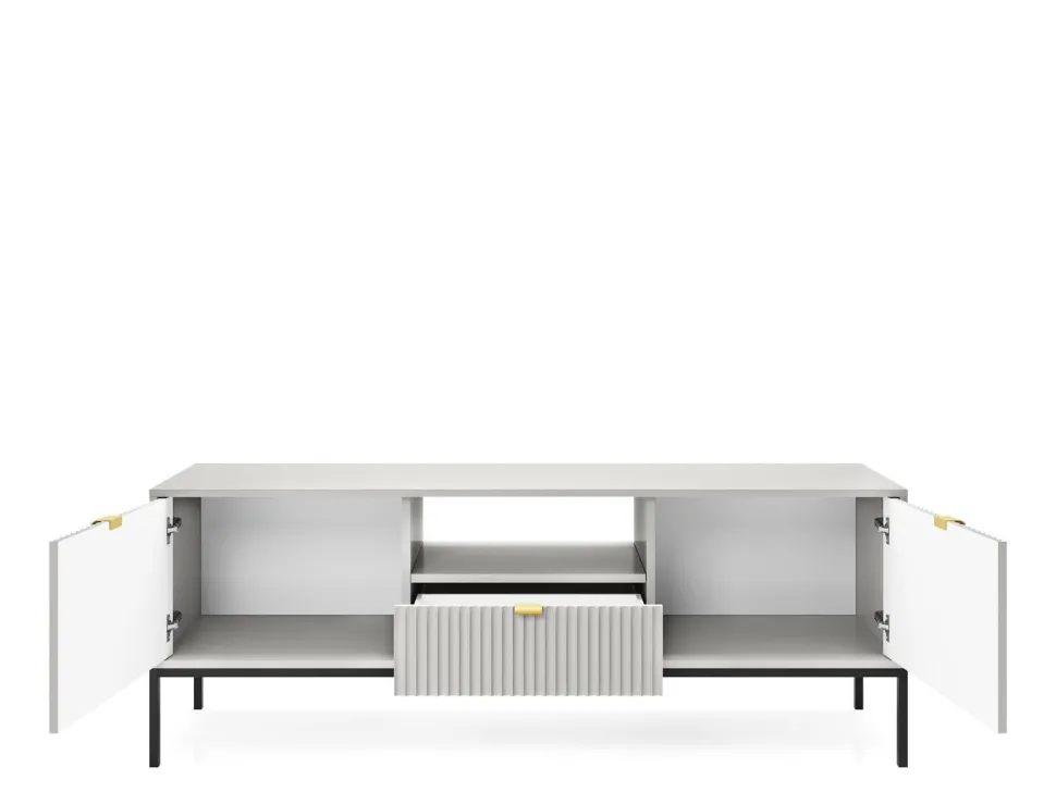 Uzyskaj nowoczesny i stylowy wygląd dzięki ryflowanej szafce Delicious od Intesi. Szafka ma ryflowane fronty szuflad i szafek podkreślone aluminiowym uchwytem w kolorze złotym. Szafka ma 154 cm szerokości i 39 cm głębokości, dzięki czemu idealnie nadaje się do przechowywania dekoderów, ładowarek, konsol do gier i nie tylko!