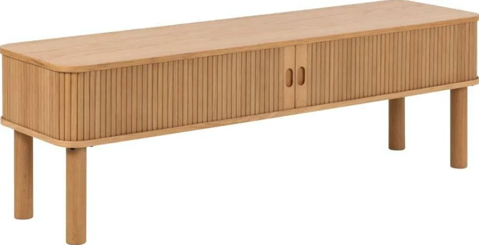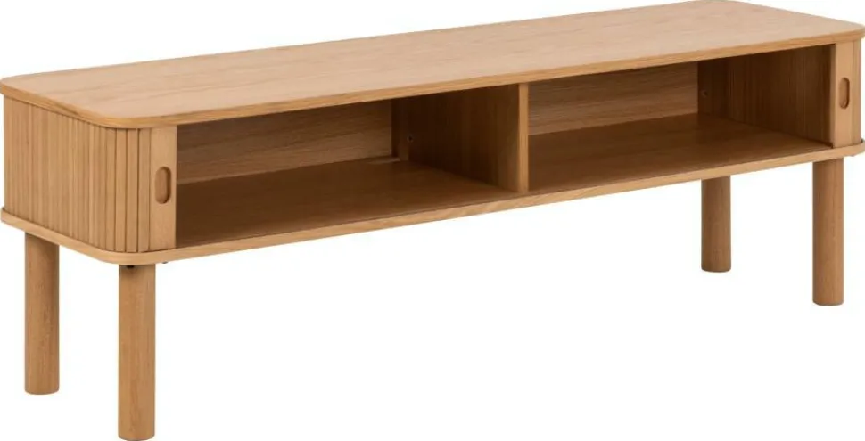 Szafka pod telewizor Langley wykonana jest z wysokiej jakości materiałów. Blat i rama zostały pokryte fornirem dębowym PU, co nadaje im eleganckiego wyglądu. Drzwi również wykonane są z forniru dębowego NC, a podstawa z dębu NC. Front szafki ma lamelowy design, a drzwiczki są przesuwne.