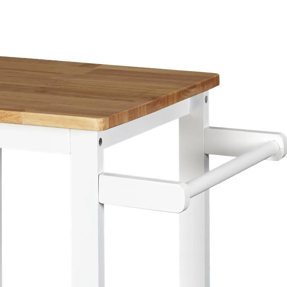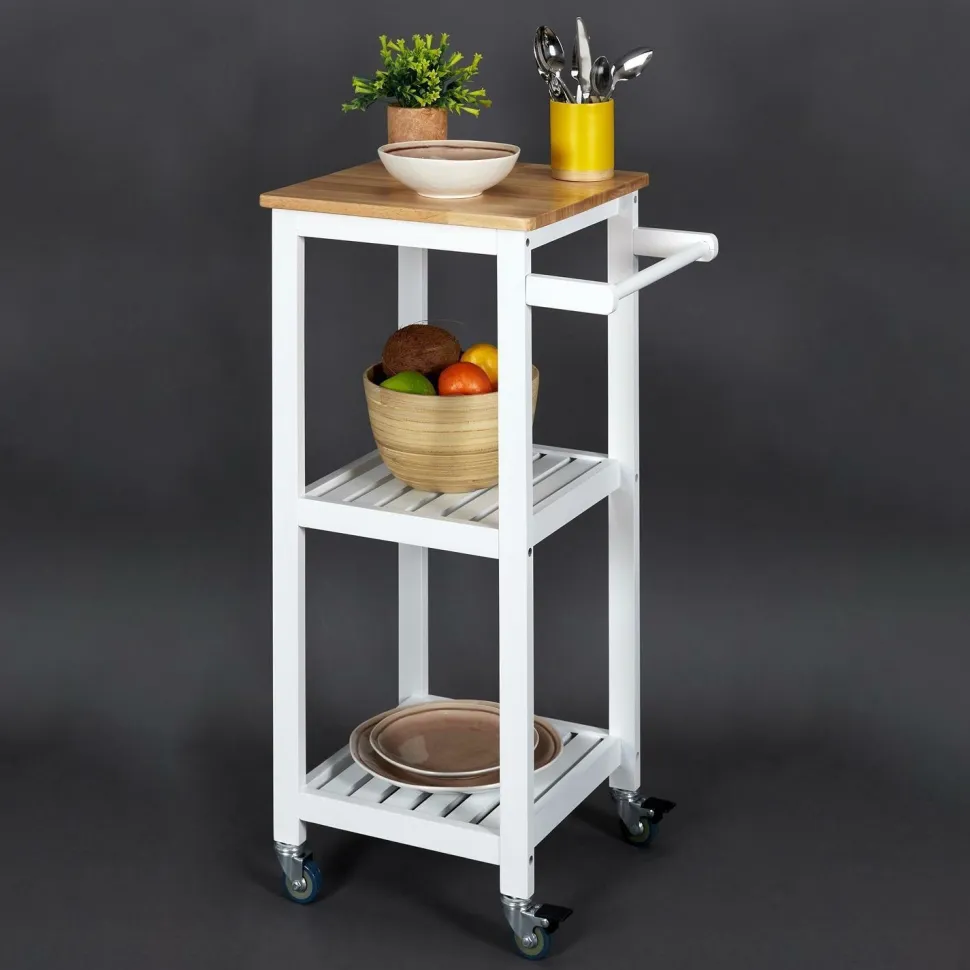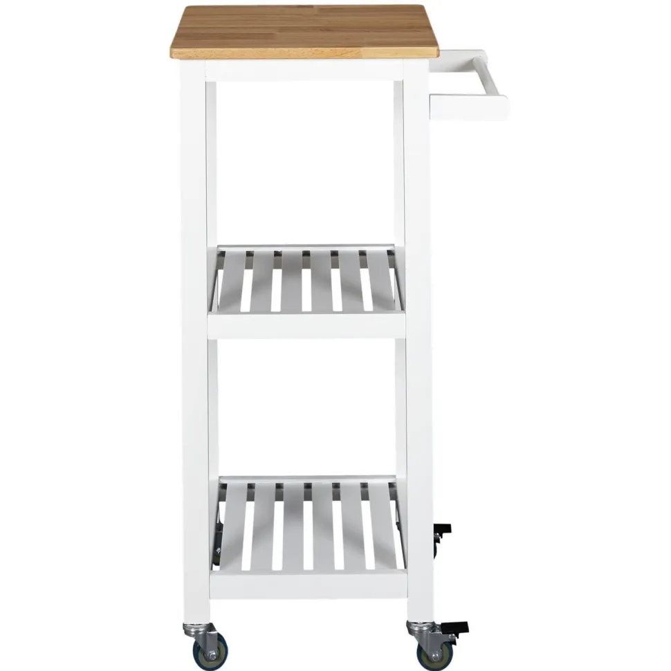 Biały wózek kuchenny to wielofunkcyjny mebel, który możemy wykorzystać nie tylko na przechowywanie warzyw lub przypraw. Wózek może służyć również jako dodatkowy blat pomocniczy w kuchni lub jadalni. Wózek Bish może pełnić również funkcję barku na kółkach, gdyż posiada uchwyt, za pomocą którego możemy go przesuwać. Wózek posiada dwie białe ażurowe półki oraz blat w okleinie imitującej drewno. Wózek został wyprodukowany z bardzo wytrzymałej płyty MDF.Waga mebla: 5,5 kgWymiary opakowania: 12,00 × 39,00 × 79,00 cm