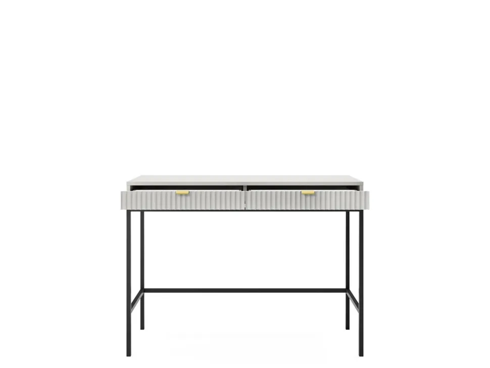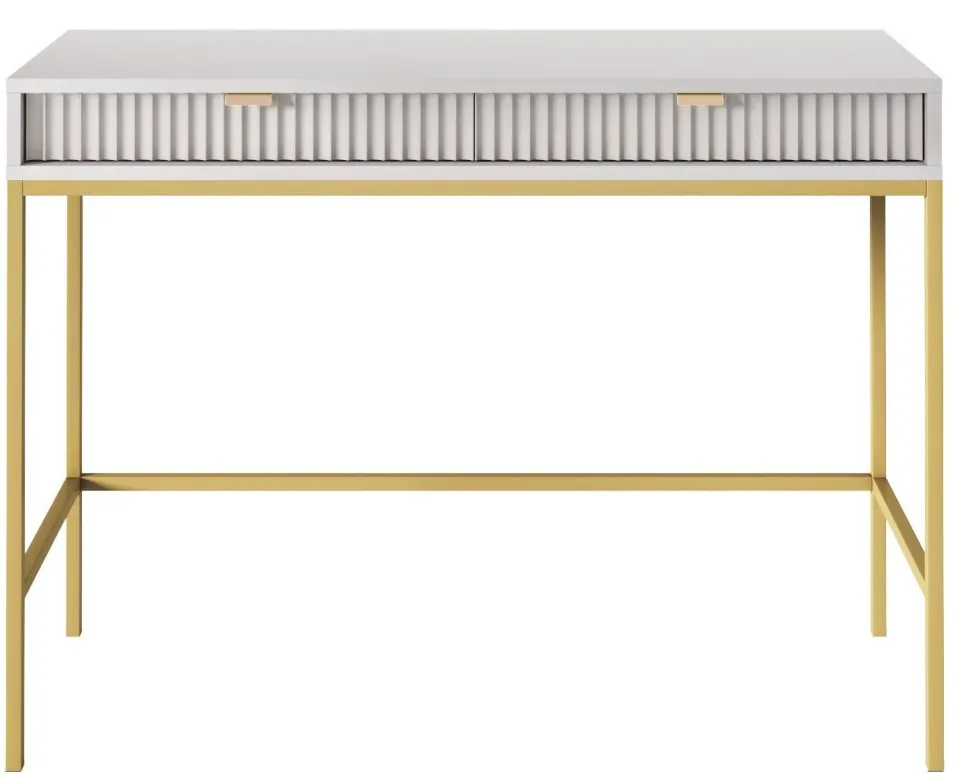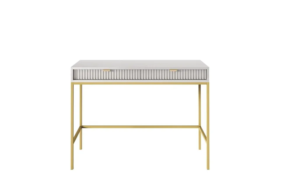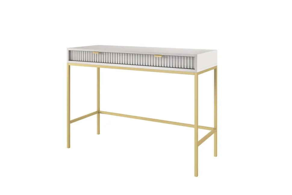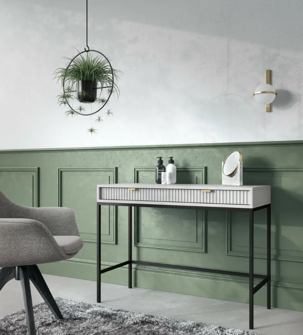 Szukałeś idealnego połączenia stylu i funkcjonalności? Nie szukaj dalej niż Toaletka Delicious! Zachwycająca toaletka zapewni nie tylko ponadczasową estetykę, ale także mnóstwo możliwości przechowywania. Wykonana z ryflowanymi frontami szuflad, które są pięknie podkreślone aluminiowym uchwytem w kolorze złotym, toaletka natychmiast ulepszy wygląd każdej przestrzeni życiowej! Niestandardowy stolik o szerokości 104 cm i głębokości 50 cm zapewnia wystarczająco dużo miejsca do schludnego przechowywania ładowarki do telefonu, kosmetyków, kluczy i innych rzeczy, jednocześnie utrzymując wszystko w porządku – sprytny styl w najlepszym wydaniu! Ponadto metalowe nogi podstawy zapewniają niezawodną wytrzymałość, a wyższy profil umożliwia wygodne odkurzanie i wycieranie pod nim, zapewniając najwyższy spokój ducha. Wyróżnij się z tłumu dzięki Delicious Toiletry – oszałamiającemu projektowi, który z pewnością wzbudzi podziw!