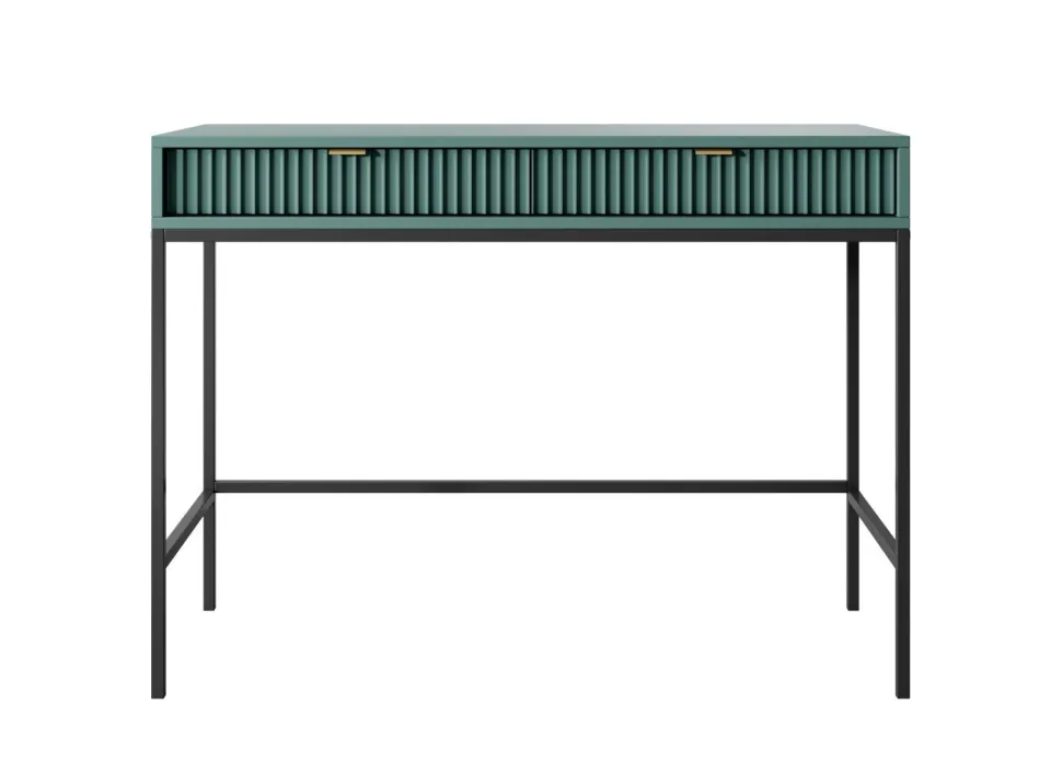 Delicious to toaletka, która łączy w sobie nowoczesny design z praktycznymi rozwiązaniami. Jej zielony kolor z ryflowanymi frontami szuflad oraz złotymi uchwytami z aluminium dodają wnętrzu niepowtarzalnego uroku. Ponadto, dzięki swoim wymiarom (szerokość 104 cm, głębokość 50 cm) pozwala na uporządkowanie wielu przedmiotów, od kluczy, poprzez ładowarki telefonów, aż po kosmetyki. Toaletka posiada wysokie, metalowe nogi, które umożliwiają łatwe sprzątanie pod meblem. Cienkie, eleganckie nogi dodają toaletce wizualnej lekkości, co jest szczególnie ważne w małych pomieszczeniach.