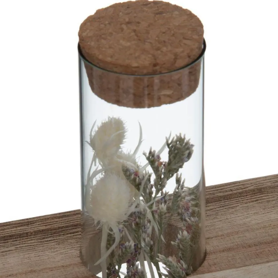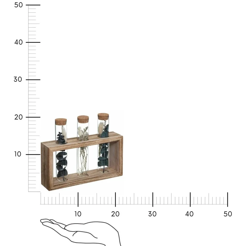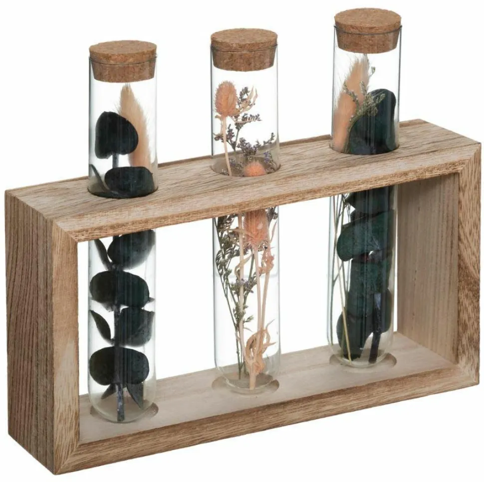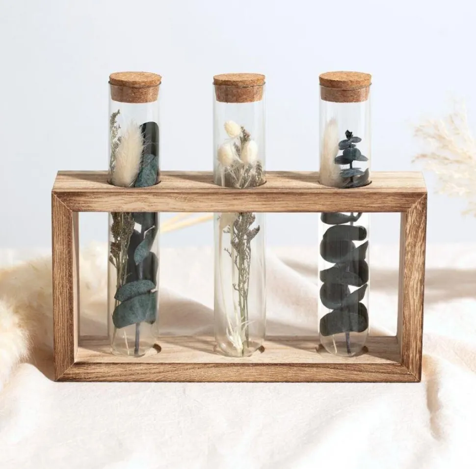 A co najlepsze, w każdym wazonie są różne rodzaje suszonych kwiatów. Podstawę wykonano z drzewa Paulownia i natomiast szklane rurki zamknięte są korkiem. Dodaj przyjaznych, naturalnych materiałów do wystroju domu — wybierz tę piękną drewnianą podstawę z trzema wazonami!