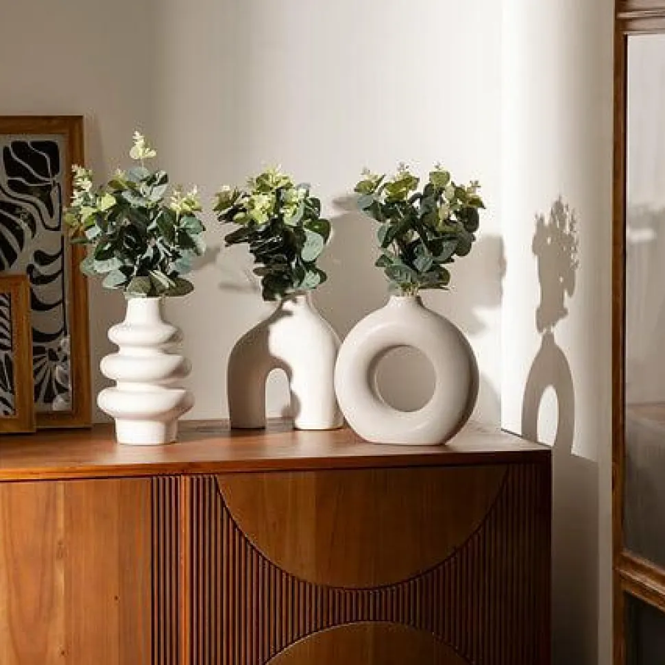 Wykonany z tworzywa sztucznego, wazon Suza potrójny jest nie tylko stylowy, ale również wytrzymały i łatwy do czyszczenia. Jego biały kolor dodaje mu uniwersalności, pozwalając na łatwe wpasowanie go w każde wnętrze. A sztuczne gałązki eukaliptusa dodają mu naturalnego uroku, bez konieczności dbania o roślinę.