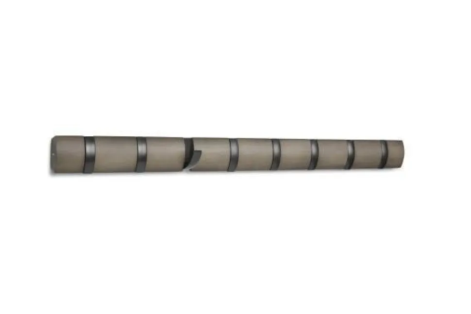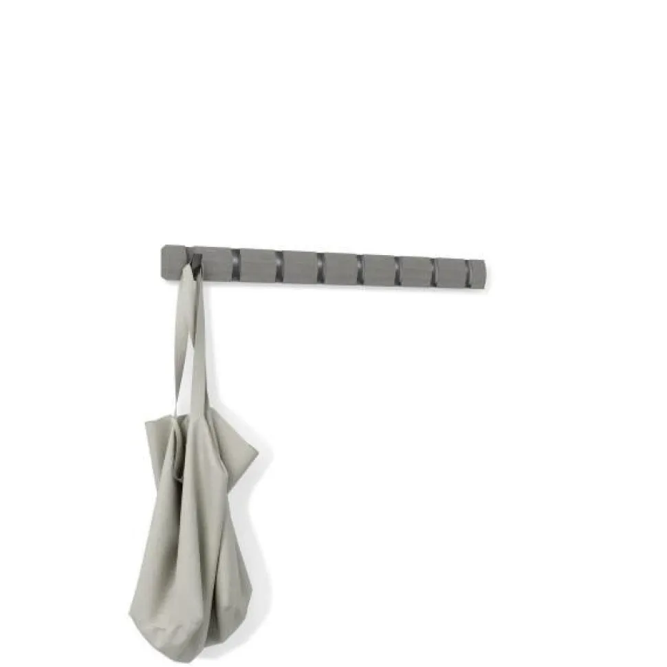Wieszak na ubrania Umbra Flip szary to masywna, solidnie wykonana listwa z ośmioma ciemnymi i wysuwanymi haczykami. Został on wykonany z tworzywa oraz drewna jesionu. Gdy haczyk nie jest potrzebny, złożysz go jednym ruchem ku górze. Ale nie daj się zwieść kompaktowemu wyglądowi, ponieważ Flip może pomieścić zaskakująco dużą liczbę przedmiotów, dzięki czemu jest idealnym miejscem do powieszenia płaszczy, szalików, torebek i innych rzeczy dla Ciebie, Twojej rodziny i gości. Dzięki eleganckiemu profilowi i ukrytemu elementowi montażowemu Flip montuje się bezproblemowo na praktycznie każdej ścianie i oferuje styl, który wygląda świetnie w każdym przedpokoju. Maksymalne obciążenie 2,3 kg na jeden haczyk.